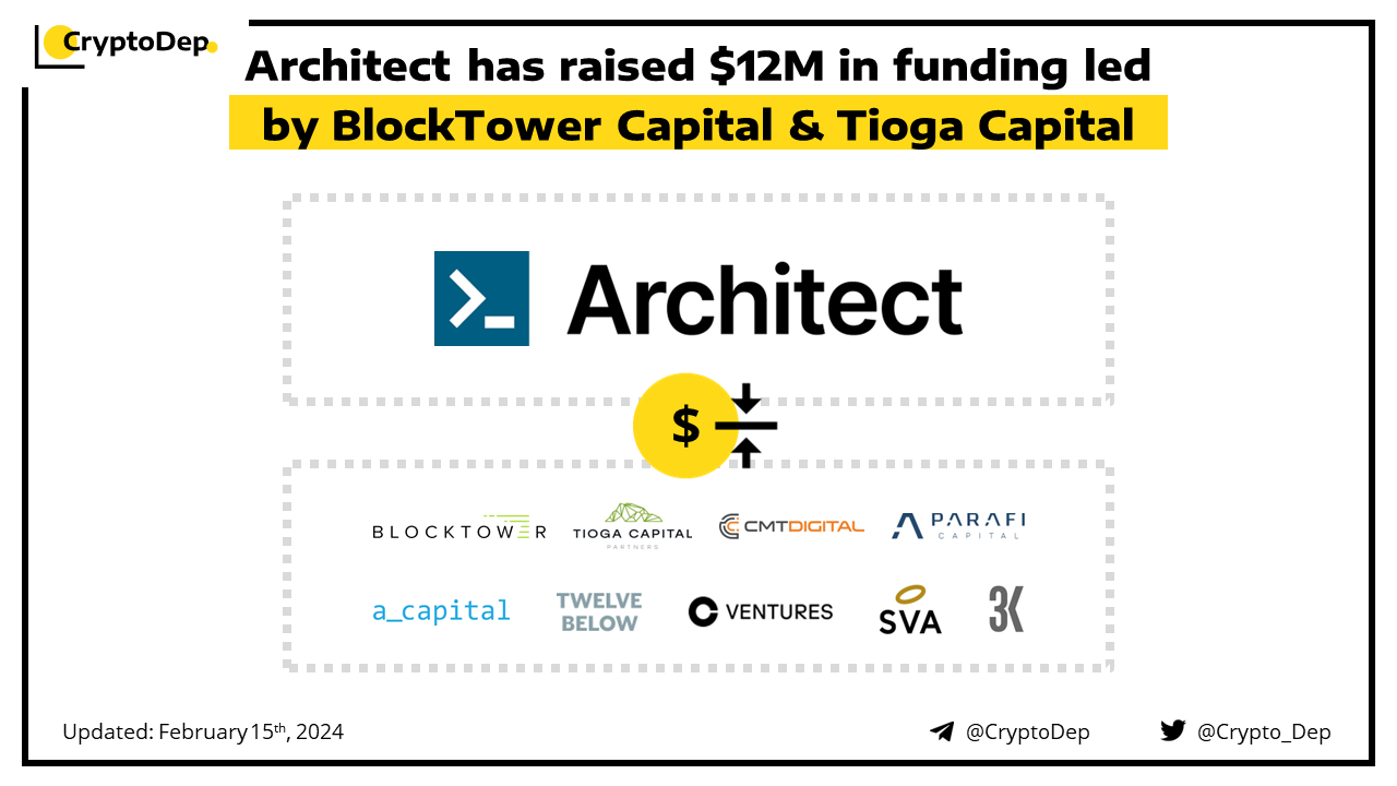 Architect, a software company that develops institutional-grade infrastructure for trading across global digital asset markets, has closed its $12M investment round led by BlockTower Capital and Tioga Capital. Additional round participants included CMT Digital, ParaFi Capital, A Capital, Twelve Below, Coinbase Ventures, SV Angel, Third Kind, SALT Fund, and US Digital Trust.
