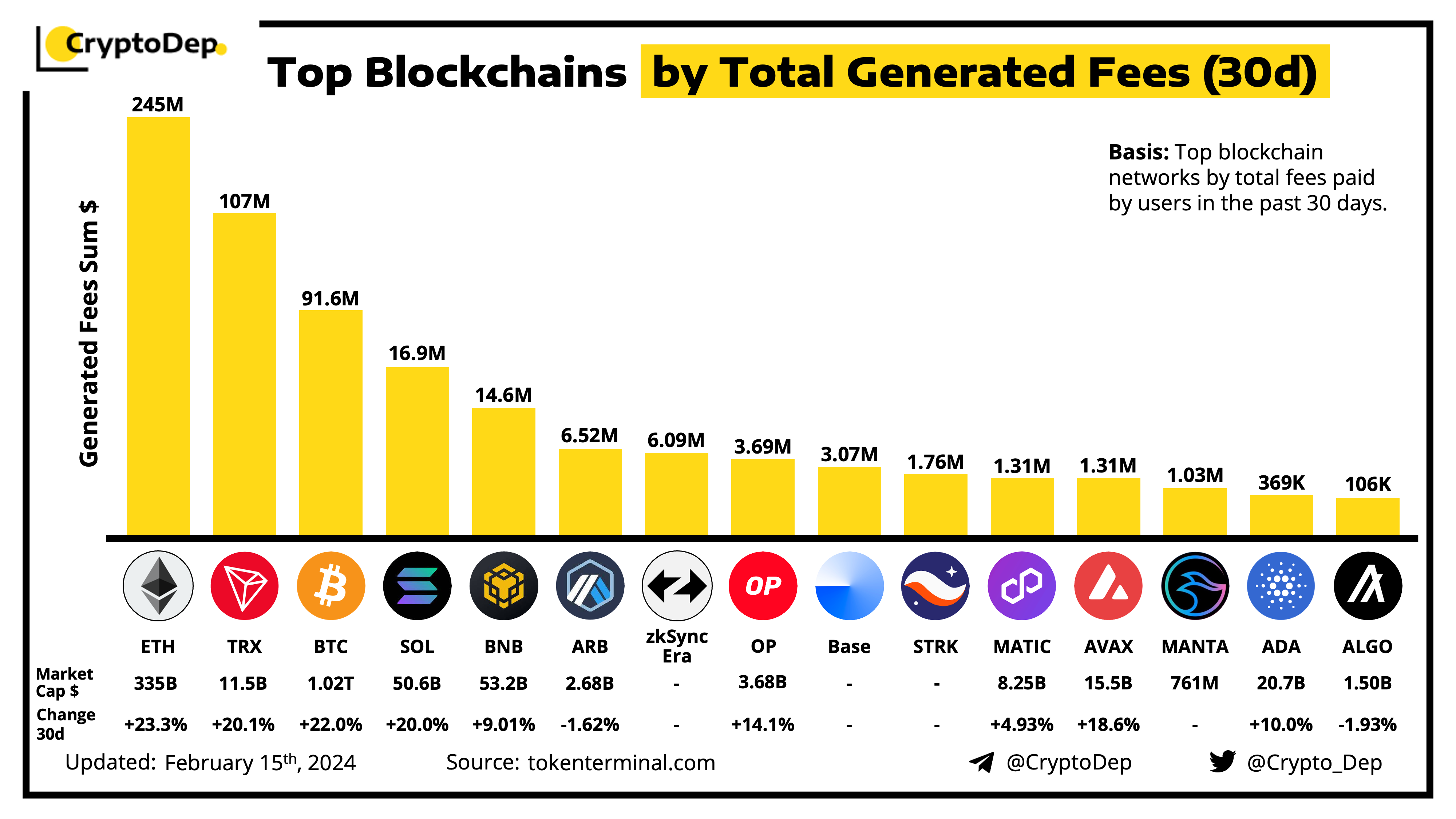 Let's take a look at the ranking of top blockchain networks by total fees paid by users in the past 30 days, according to the data from Tokenterminal.