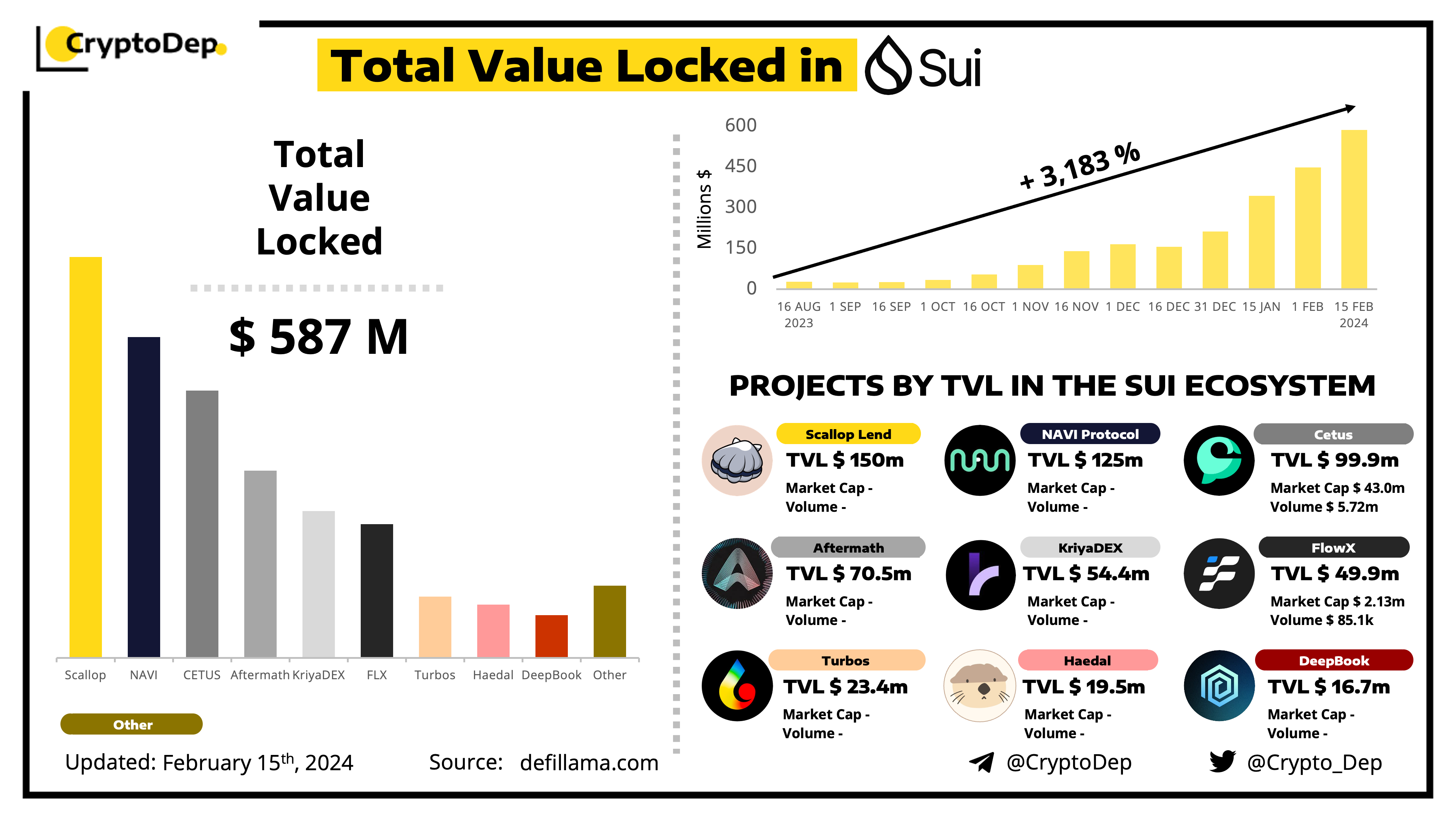 Let's take a look at the general TVL overview of the whole #Sui ecosystem, diving into the rankings of top chain's protocols by TVL, their market share, and current market stats. According to the data from DefiLama, Scallop Lend leads by TVL, followed by NAVI Protocol, Cetus Protocol, Aftermath Protocol, KriyaDEX, and others.