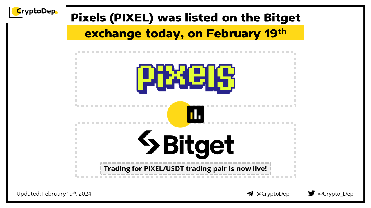 Trading for the $PIXEL token is now live on Bitget! Deposits are now open and withdrawals will open on February 20th, 12:00 UTC. Pixels (PIXEL) is a social casual web3 game powered by the Ronin Network, It involves a mesmerizing open-world game that revolves around farming, exploration, and creation.