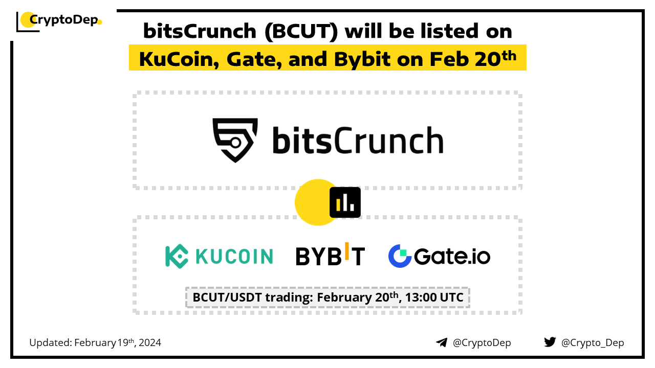 ββbitsCrunch (BCUT) will be listed on KuCoin, Gate, and Bybit on Feb 20th