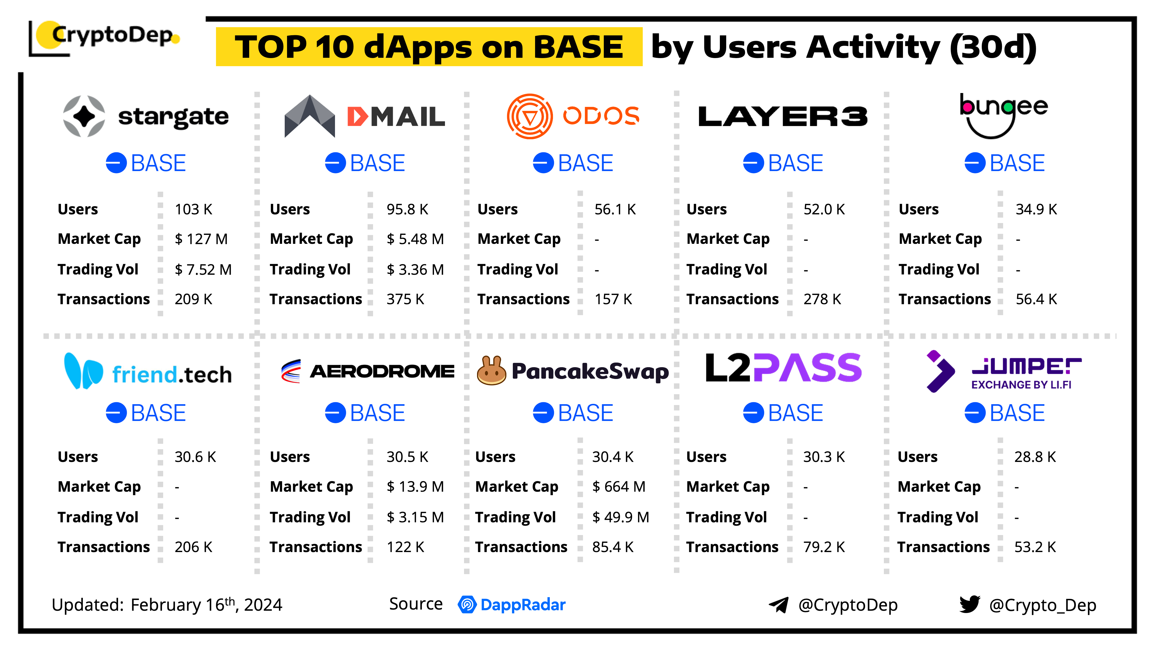 A decentralized application (dApp) is a program built on blockchain that combines a smart contract and a front-end user interface. We present the top dApps on #Base by users activity in the last 30 days, according to the data from DappRadar.