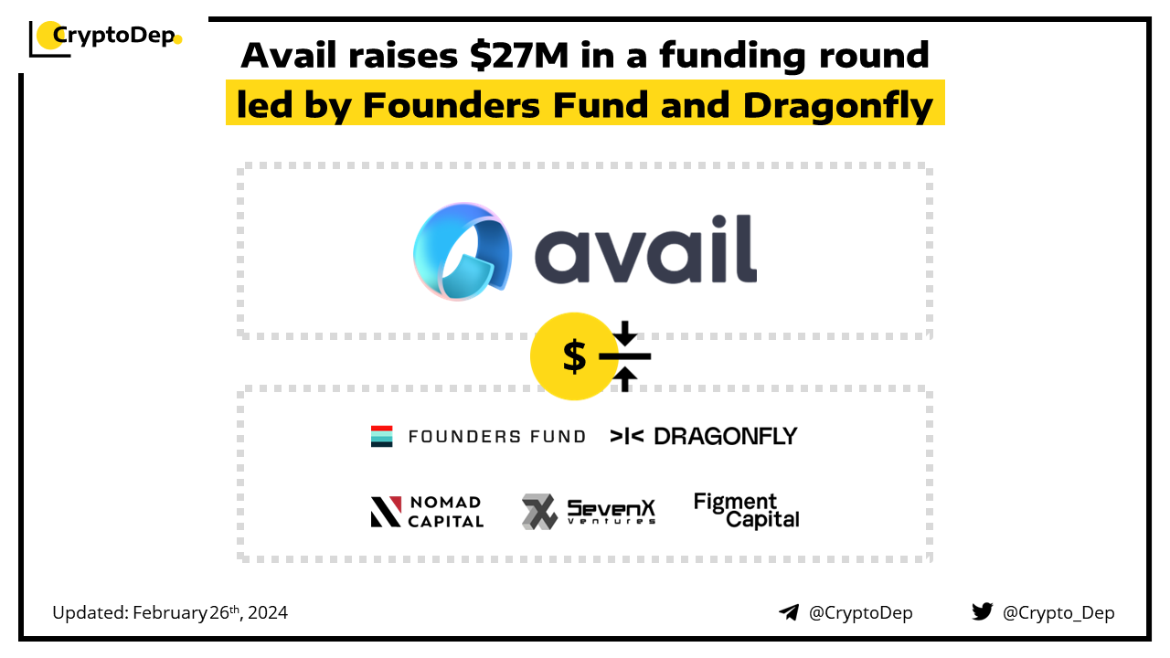 Avail has closed a $27M seed round led by Founders Fund and Dragonfly, with participation from SevenX, Figment, Nomad Capital, and several angel investors including Balaji Srinivasan, Sunny Aggarwal, Mudit Gupta, and Amrit Kumar. The funds will be used to develop three of its core products: its data availability solution, Nexus, and Fusion, collectively marketed as the Trinity. The new DA project is expected to go live early in Q2 of 2024.