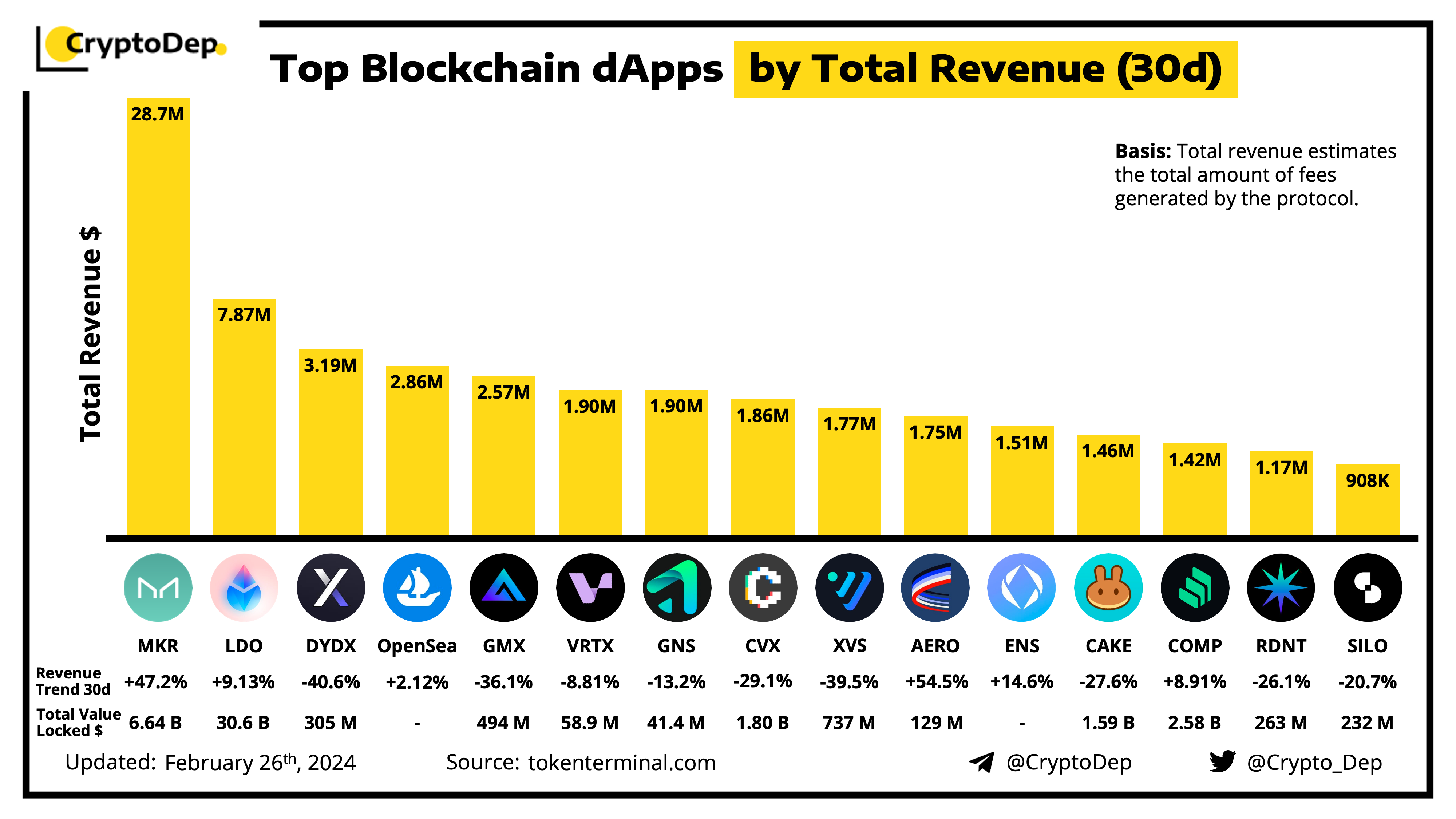 Decentralized applications (dApps) operate on a blockchain network and have gained popularity in recent years. In this post, we analyze the data from Token Terminal and rank the top blockchain dApps by total revenue in the last 30 days, to understand which dApps are generating the most income and why.
