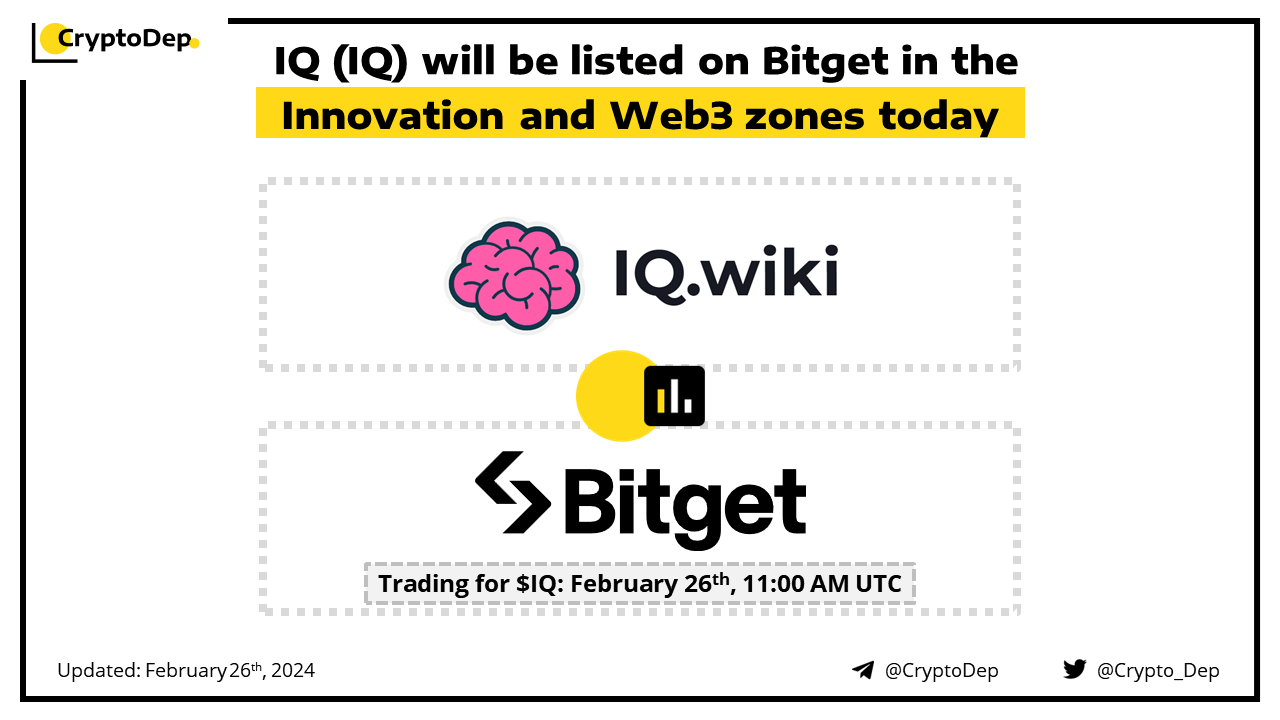 Trading for the IQ/USDT will be live on Bitget, on February 26th, at 11:00 AM UTC. Deposits are now open and withdrawals will open on February 27th, 12:00 UTC. The IQ token is a cryptocurrency dedicated to building a more intelligent future through artificial intelligence and blockchain technology.