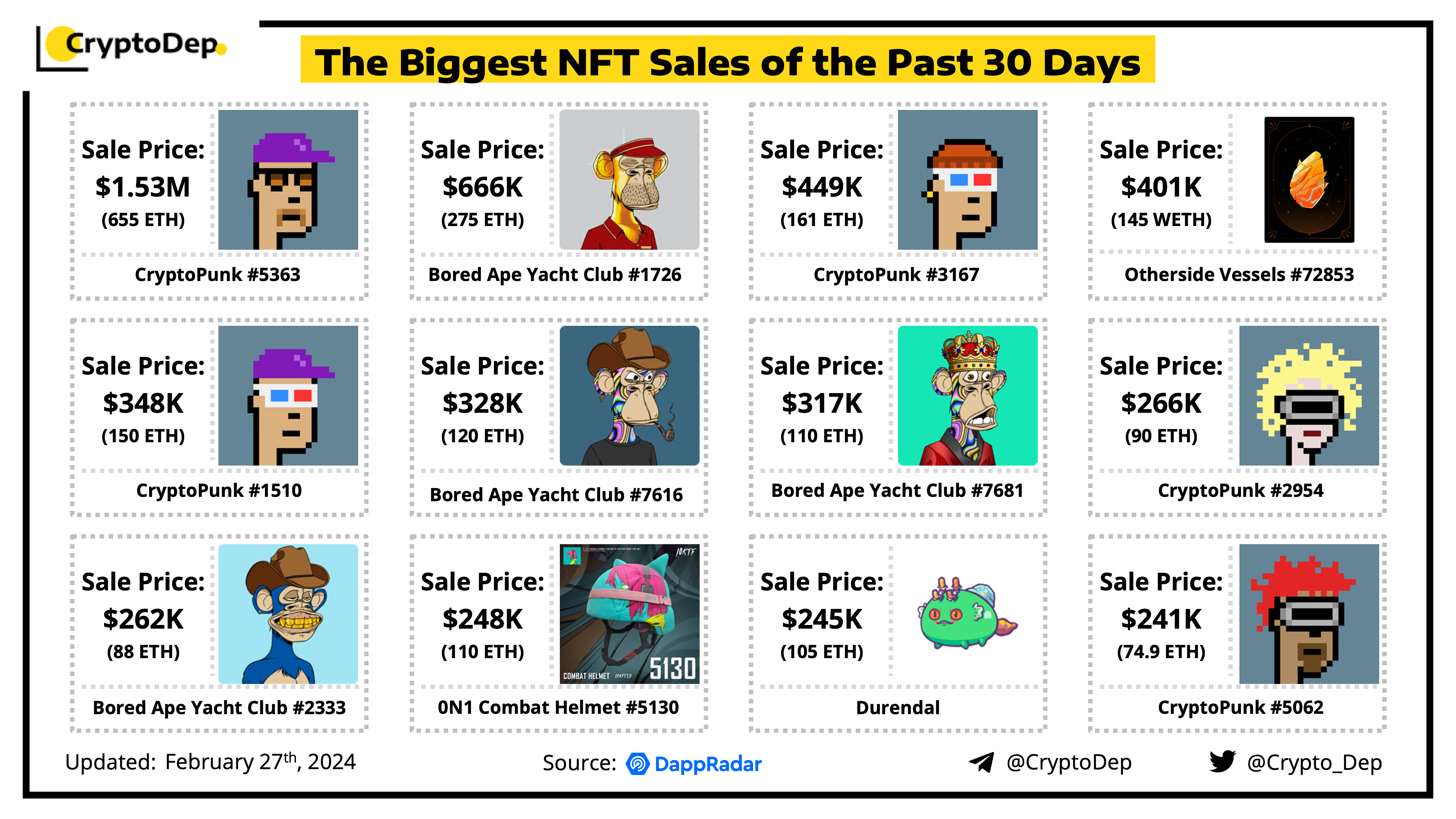 In this post, we highlight the largest Non-Fungible Token (NFT) sales that have occurred over the past month, delving into the details of each sale, including the specific NFT that was sold, and the price it fetched. Data from DappRadar.
