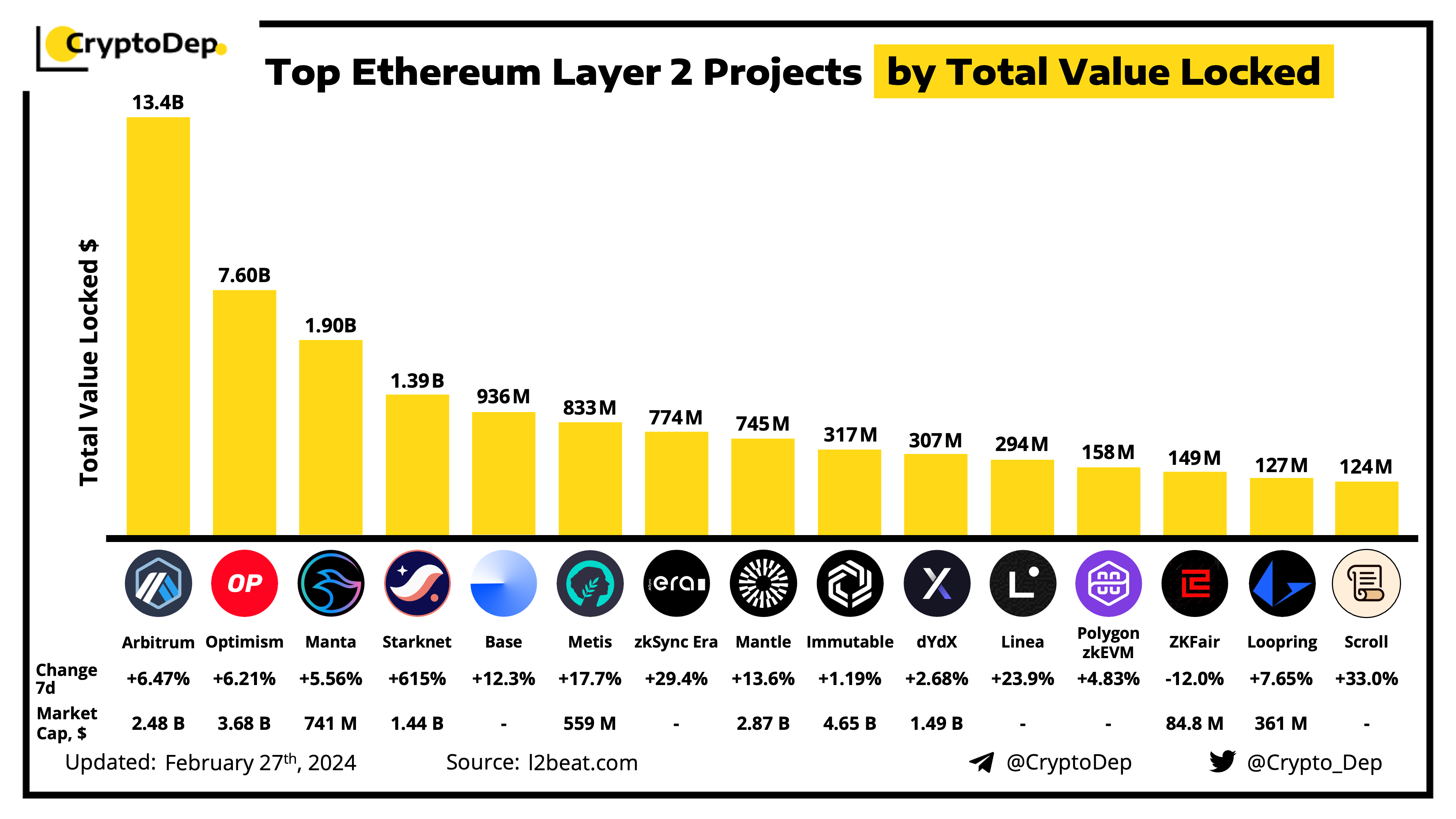 TVL is the overall value of crypto assets deposited in Ethereum Layer 2 networks. The overall TVL among all projects now equals $22.1B with Arbitrum $ARB, Optimism $OP, Manta Network $MANTA, Starknet $STRK, and Base making the top leaders.