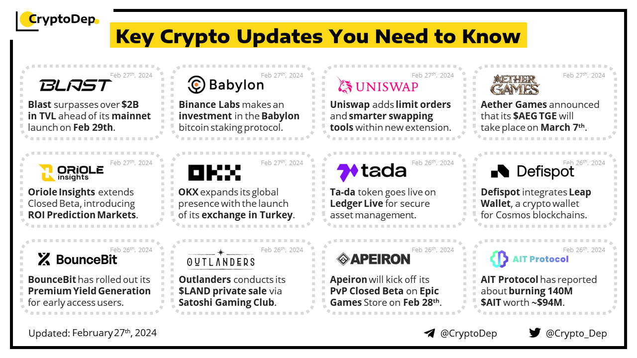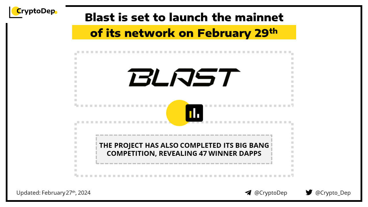 Blast, an L2 with native yield for ETH and stablecoins, has announced the upcoming launch of its mainnet on February 29th. Previously, Blast completed the Big Bang competition with 47 winner dapps. Some 50% of the future $BLAST airdrop will be allocated to the ecosystem protocols. Since the project was revealed in November, Blast accumulated $2.13B in total value locked.