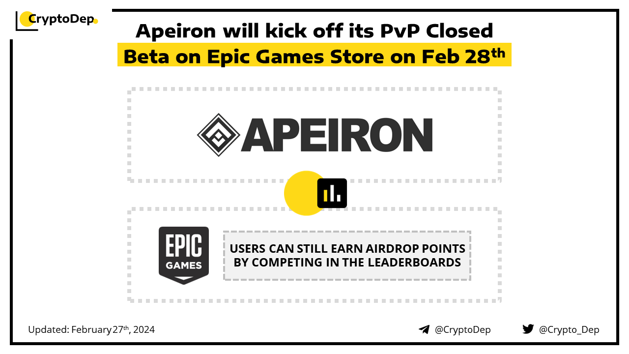 Apeiron has announced the launch of its closed PvP Beta on the Epic Games Store that will take place tomorrow, on February 28th. Users will be able to earn airdrop points by competing in the leaderboards and collecting the in-game souls that will be converted into the airdrop points at the 4:1 ratio. Apeiron is the NFT-based play-and-earn god game that has raised $13.5M in a seed funding round led by Hashed with the participation of Morningstar Ventures, DeFiance Capital, Spartan Group, and others.