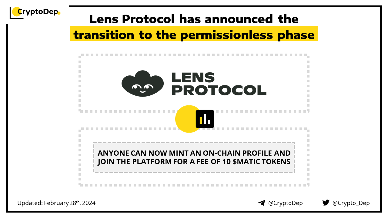 Lens Protocol, a social graph platform developed by Aave, has entered a permissionless phase. This transition allows users to create their profiles and join the platform for a fee of 10 $MATIC tokens or to pay a similar amount with a credit card. The current Lens version 2 focuses on Open Actions, a feature that enables the execution of any external smart contract action directly from Lensβ content posts. Lens Protocol previously closed its $15M funding round led by IDEO CoLab Ventures with participation from General Catalyst, Variant, Blockchain Capital, dao5, Flamingo DAO, and others.