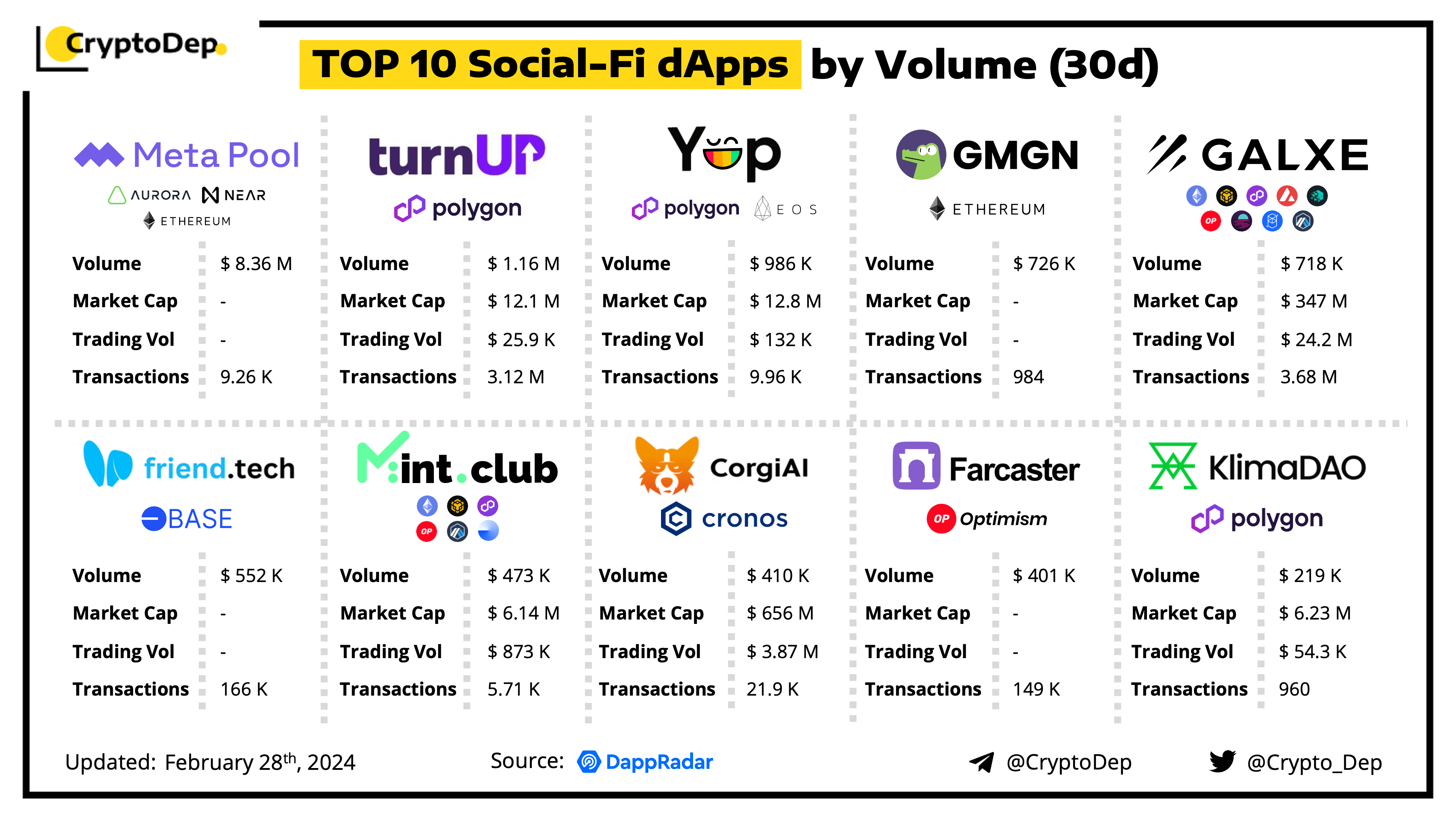 ββTOP 10 Social-Fi dApps by Volume (30d)
