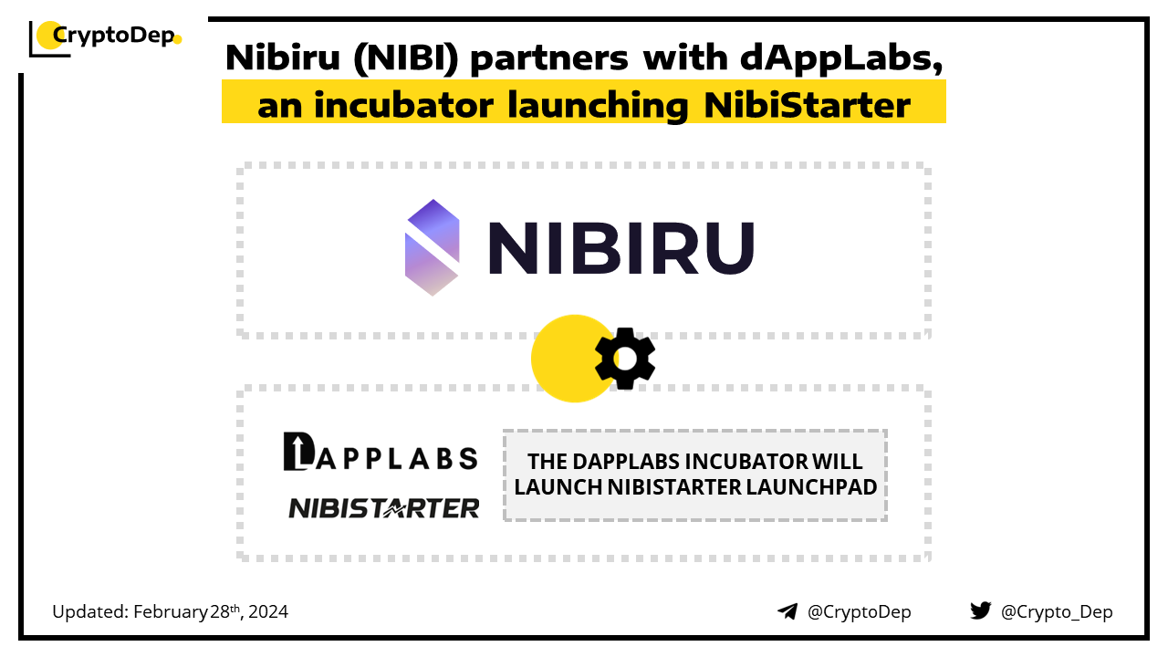 Nibiru teams up with the dAppLabs incubator that will help and incubate the funding processes of projects in the Nibiru ecosystem. DappLabs will incubate Nibistarter, a launchpad that simplifies onboarding, enabling users to effortlessly sign up using their social media accounts. Nibiru is an L1 blockchain powering a smart contract hub with DeFi, RWAs, and more, backed by Hashkey, NGC Ventures, ArkStream Capital, MV Global, and others. Previously, it has conducted its $NIBI token sale on Coinlist.