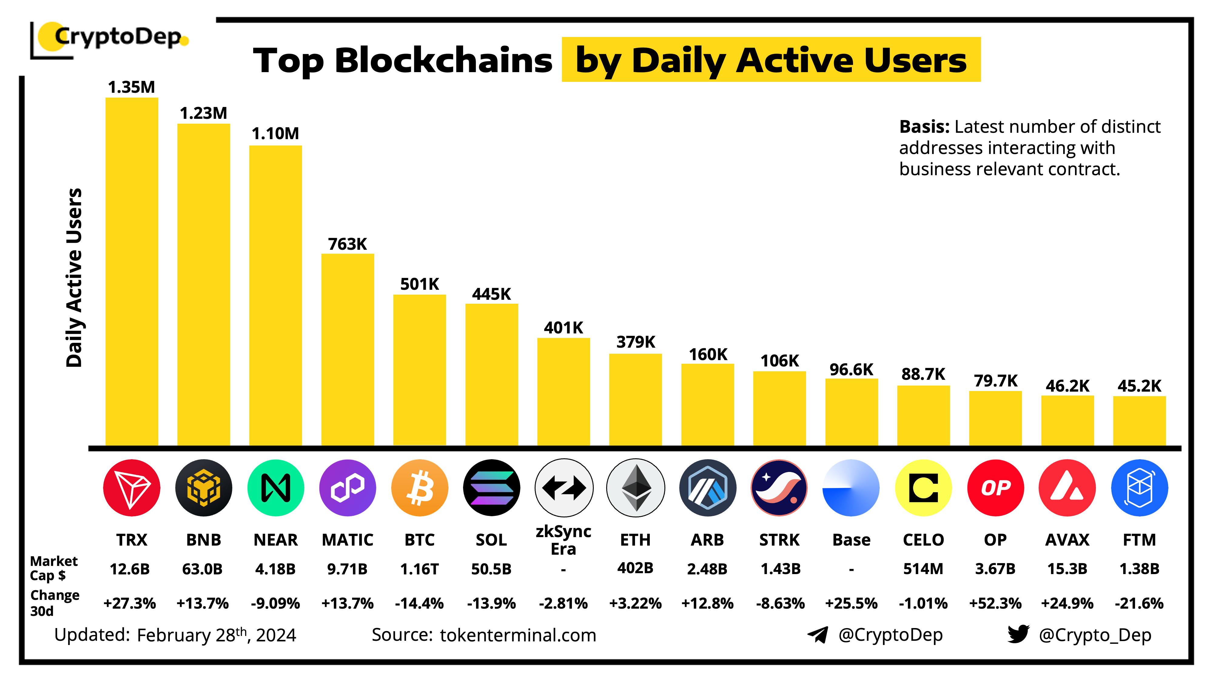 Daily active users measure the number of distinct addresses interacting with blockchains' relevant contracts. According to the data from TokenTerminal, Tron, BNB Chain, Near, Polygon, and Bitcoin networks have drawn the largest numbers of users lately.