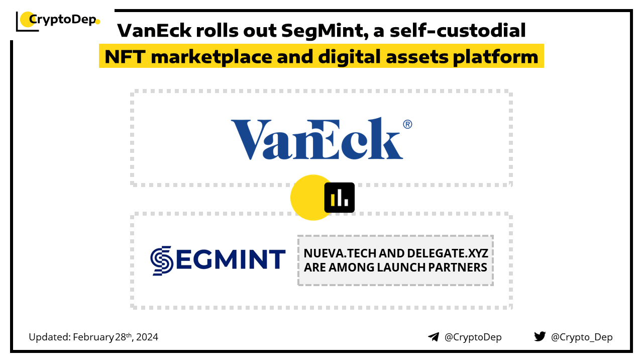 VanEck, a global investment manager, has launched an NFT marketplace and digital assets platform called SegMint in collaboration with Nueva.TΠ΅Ρh, Delegate.Ρ Ρz, MINTangible.ΡΠΎ, PortΠ°ls.tΠΎ and Walletchat fun. SegMint aims to simplify the self-custodial sharing of digital assets by providing custom multi-sig wallet solutions, NFT minting capabilities, and token-gated utility. VanEck was one of the first to file an application for a spot bitcoin ETF in the U.S..
