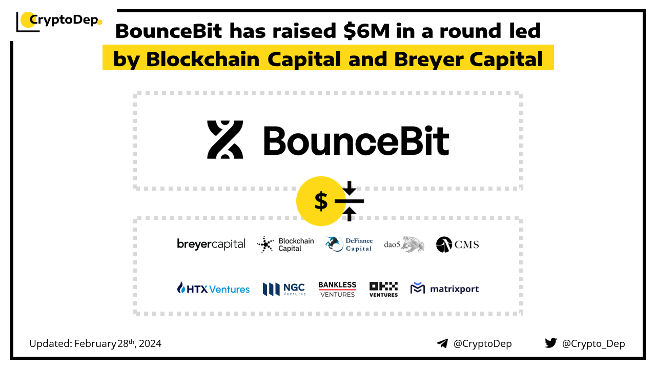 BounceBit closes its $6M seed funding round co-led by Blockchain Capital and Breyer Capital. Other investors in the round included CMS Holdings, Bankless Ventures, NGC Ventures, Matrixport Ventures, DeFiance Capital, OKX Ventures, HTX Ventures, Bixin Ventures, Nomad Capital, and others. BounceBit has also rolled out its Premium Yield Generation for early-access users and will launch its testnet on March 8th.