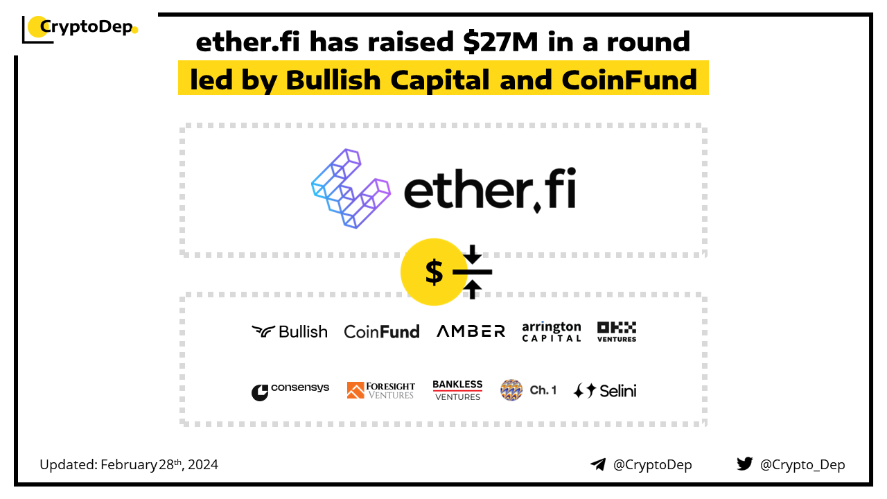 ether.fi. a liquid restaking protocol, closes its $27M Series A investment round led by Bullish Capital and CoinFund, with participation from Arrington Capital, OKX Ventures, Foresight Ventures, Consensys, Amber, Bankless Ventures, Selini, Chapter One, and others. The project now has $1.66B in TVL. The $27M is split between a previously unannounced SAFE closed late last year and a Series A.