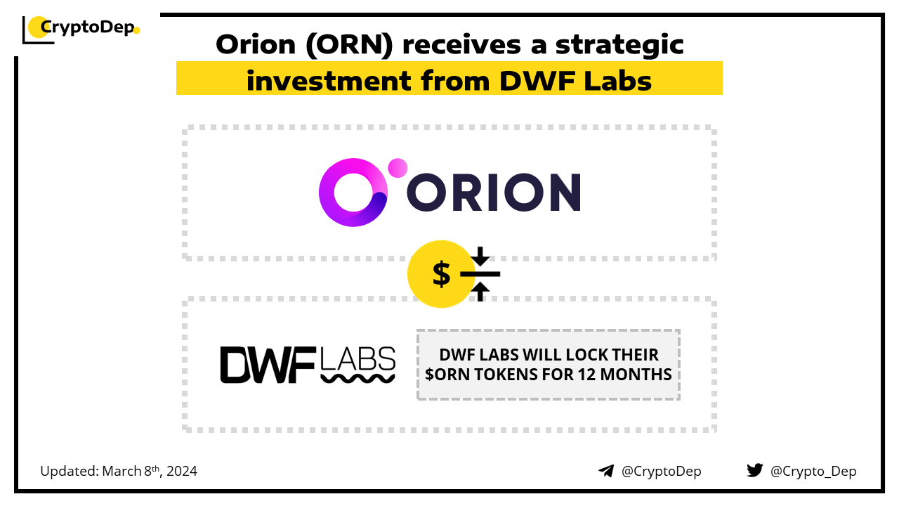 Orion $ORN has announced a strategic investment from DWF Labs, an asset market-making and web3 investment firm. DWF Labs has agreed to lock their $ORN tokens for 12 months, ensuring a long-term support. Orion will soon conduct a transition to DeFi infrastructure Lumia, announced earlier in February. Orion offers a suite of DeFi products with instant access to aggregated liquidity from both centralized and decentralized exchanges across multiple blockchains.