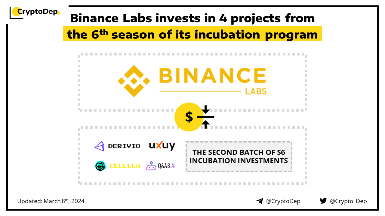 Binance Labs makes the second series of investments in projects from the S6 Incubation Program. The second cohort of investment recipients included Cellula, Derivio, QnA3, and UXUY. This move follows Binance Labs' previous investment in 3 other projects from the S6 incubation, including NFPrompt, Ethena Labs, and Shogun. Moreover, Binance will shortly share the details of Labs Incubation Season 7.