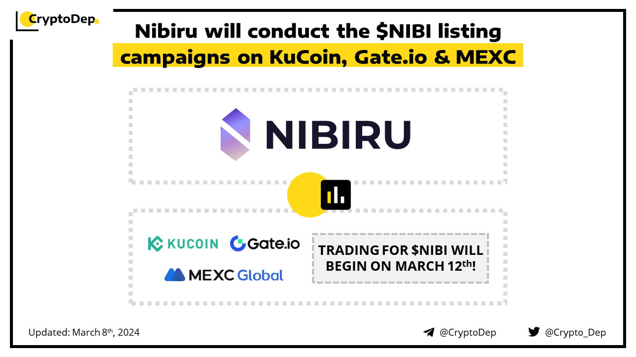 Nibiru will be listed on KuCoin, GΠ°tΠ΅.ΡΠΎ, MEXC, and Bybit on March 12th, at 8:00 AM UTC. Users can also participate in the Gate Startup, BurningDrop, and Bybit Launchpool promotions on GΠ°tΠ΅.ΡΠΎ, KuCoin, and Bybit respectively. Nibiru is an L1 blockchain powering a smart contract hub with DeFi, RWAs, and more, backed by Hashkey, NGC Ventures, ArkStream Capital, MV Global, and others.