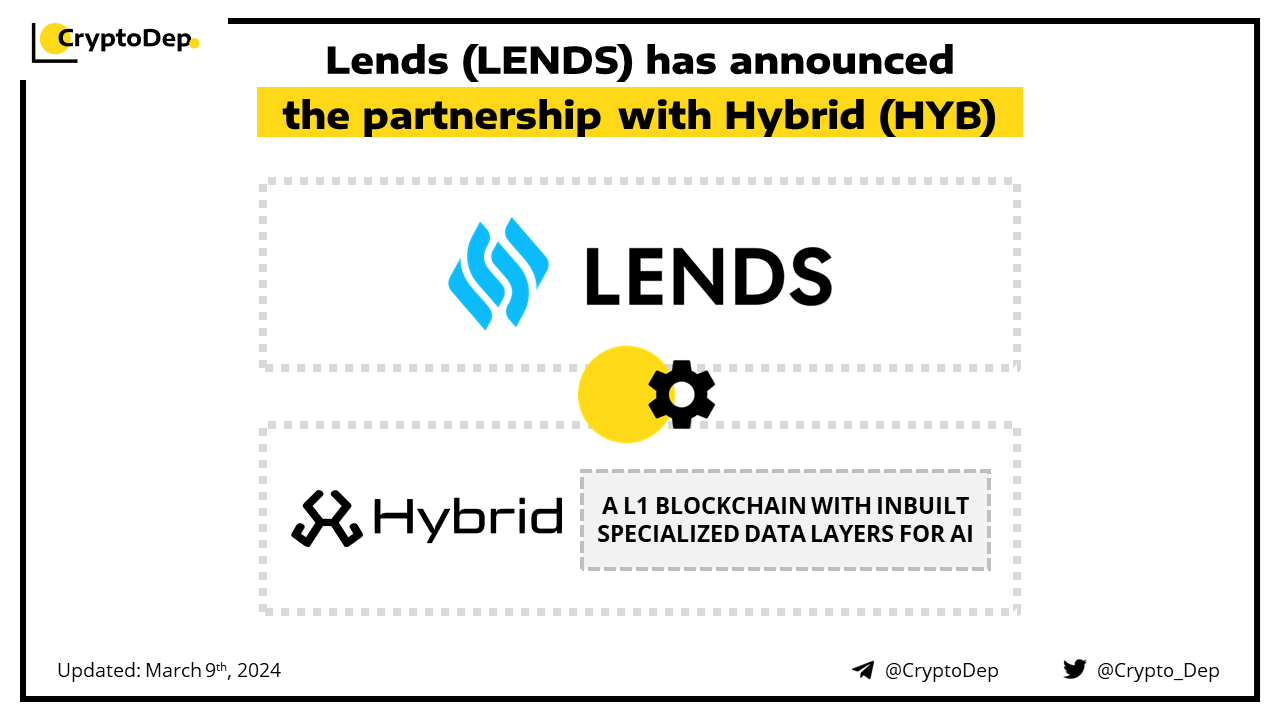 Lends has teamed up with Hybrid, an EVM-compatible Layer 1 blockchain enriched with specialized data layers for AI. The partnership will be focused on co-marketing. Moreover, the Lends community can participate in the Hybrid Galxe campaign to earn a $HYB token airdrop.