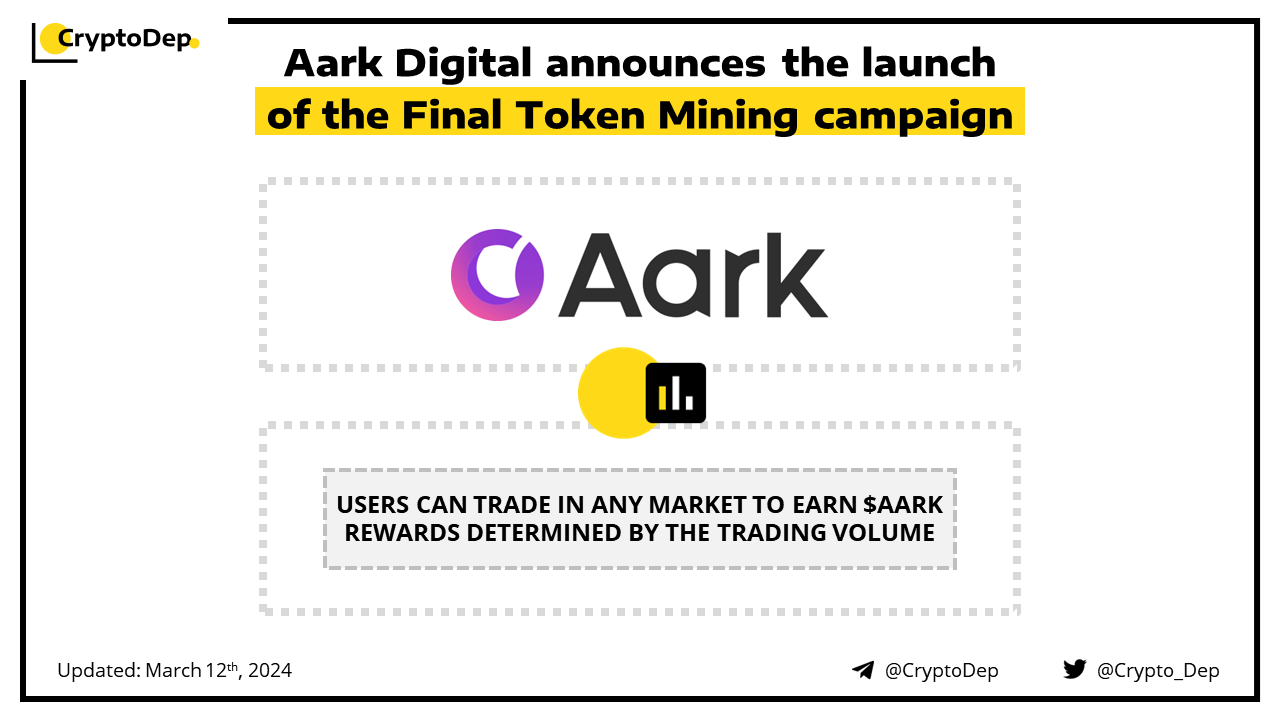 Aark Digital kicks off the Final Token Mining event that will be live for a month. Users can now trade in any market to earn $AARK rewards determined by the trading volume. The BTC/ETH market will have a prize pool of 80,000 $AARK while the altcoin markets' allocation will equal 200,000 $AARK. Aark Digital has recently partnered with the ether.fi restaking protocol. Aark Digital is the Leverage Everything Perpetual DEX for professional traders/LPs on Arbitrum, backed by Delphi Digital, OKX Ventures, Big Brain Holdings, and Keyrock.
