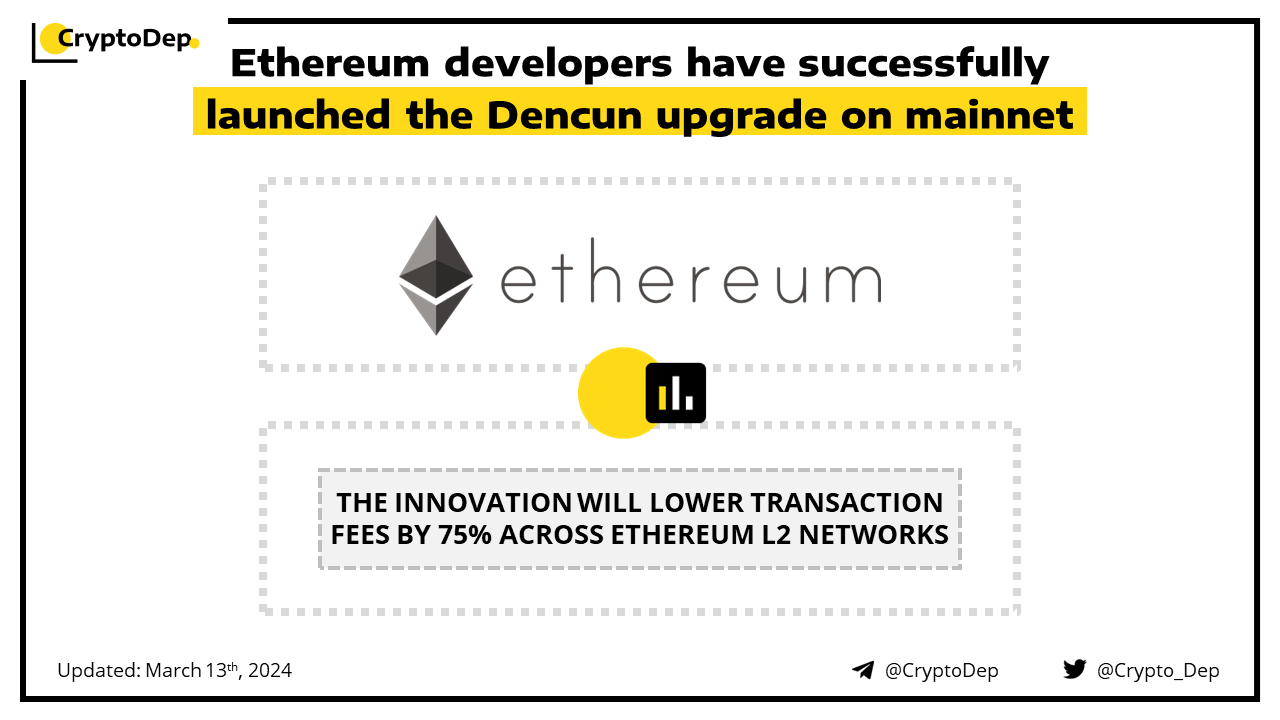The Dencun upgrade goes live on mainnet, aiming to lower transaction costs across Ethereum layer-2 networks by 75%. The update will be incorporated across all layer-2 networks after a month or two of contract settlement. The upgrade is also expected to redefine the Ethereum ecosystemβs capacity to process massive swathes of transactions, and thus lower barriers significantly for moving projects, transactions, and data on-chain.