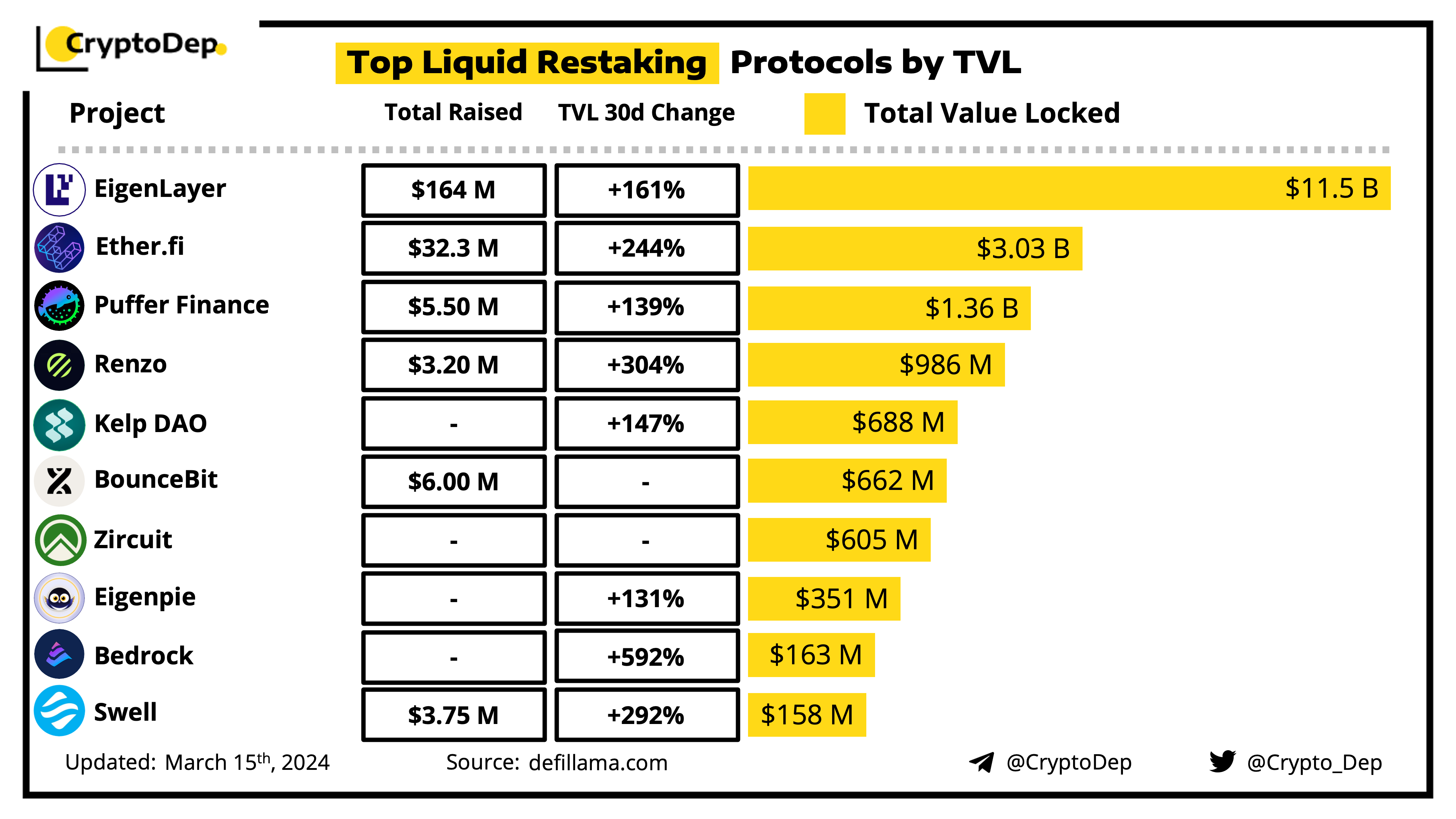 Restaking and liquid restaking protocols like EigenLayer, ether.fi, Puffer, Renzo, along with staking infrastructure chains such as BounceBit and Zircuit, have recently witnessed a notable surge in deposits. Let's take a look at the current market leaders in terms of TVL.
