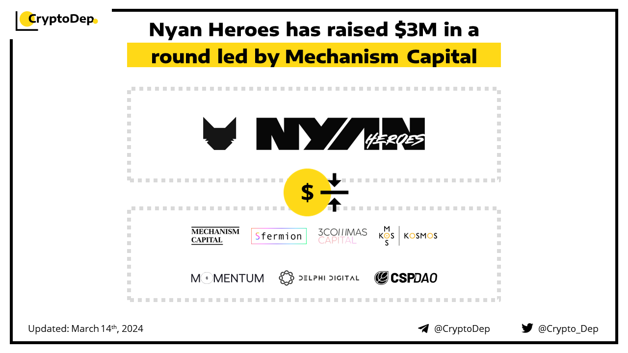 Nyan Heroes, a play-to-earn NFT shooter game built on the Solana blockchain, closes its strategic funding round led by Mechanism Capital, with participation from Momentum 6, Delphi Ventures, 3Commas Capital, Kosmos Ventures, Devmons GG and CSP DAO. Previously, it has rolled out the first stage of the $NYAN Airdrop Mission campaign. Back in 2022, Nyan Heroes raised another $7.5M from Morningstar Ventures, Kosmos Ventures, Sino Global Capital, Shima Capital, and Petrock Capital.