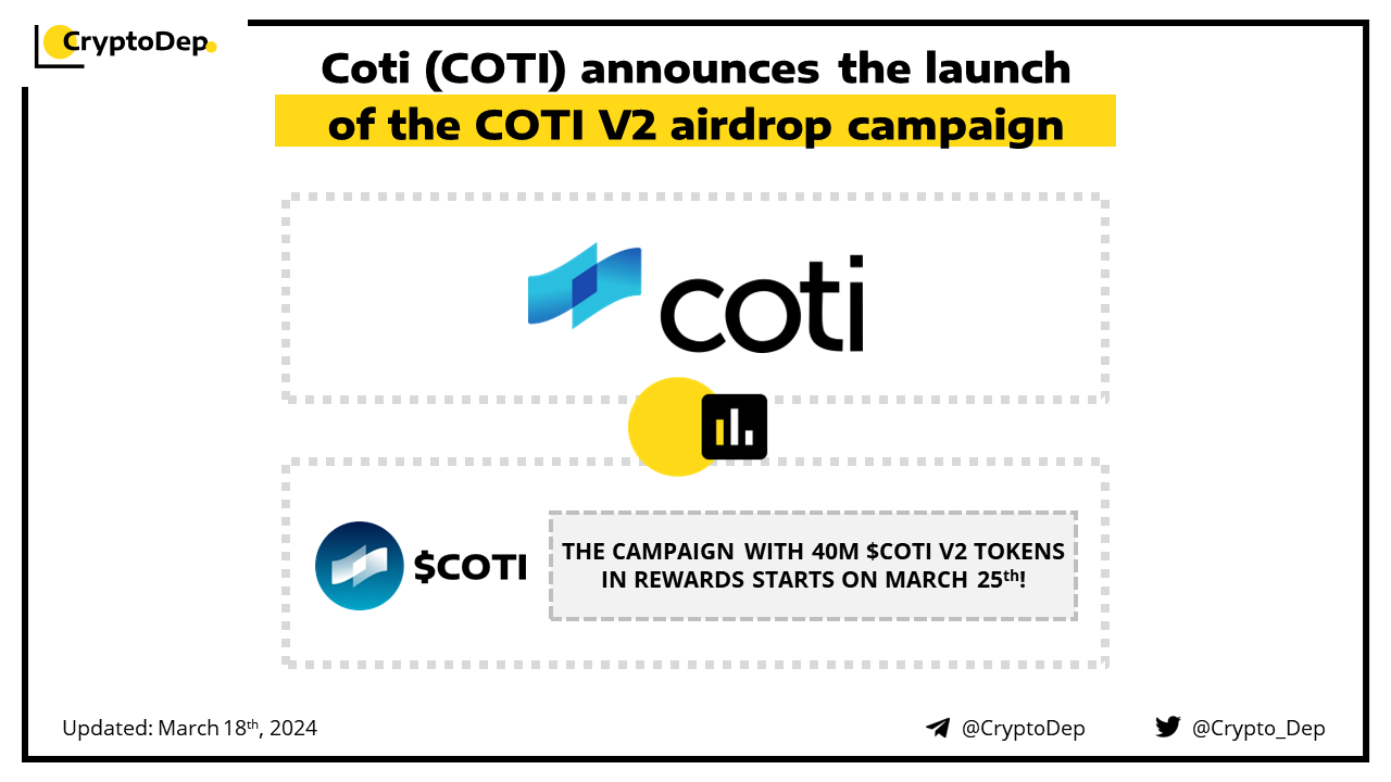 Coti will launch the COTI V2 airdrop campaign with 40M $COTI tokens (~$8M) in rewards on March 25th. Starting on March 25th, the project will distribute rewards amongst native and ERC-20 $COTI holders. Moreover, all treasury participants are automatically eligible to receive part of 40M $COTI V2 tokens, on top of their regular APY rewards. The project has previously disclosed its plans to launch COTI V2 devnet in early Q2. COTI creates the world's leading digital infrastructure for payments and enterprise tokens.