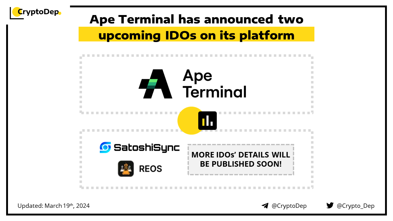 Ape Terminal will hold IDOs for SatoshiSync and Reos with more sales details to be announced soon. SatoshiSync is a permissionless chain agnostic protocol for Inscriptions and BTC L2. REOS, the BRC-20 token engineered to revolutionize reward systems within the Ordiswap ecosystem on Bitcoin's layer-1.