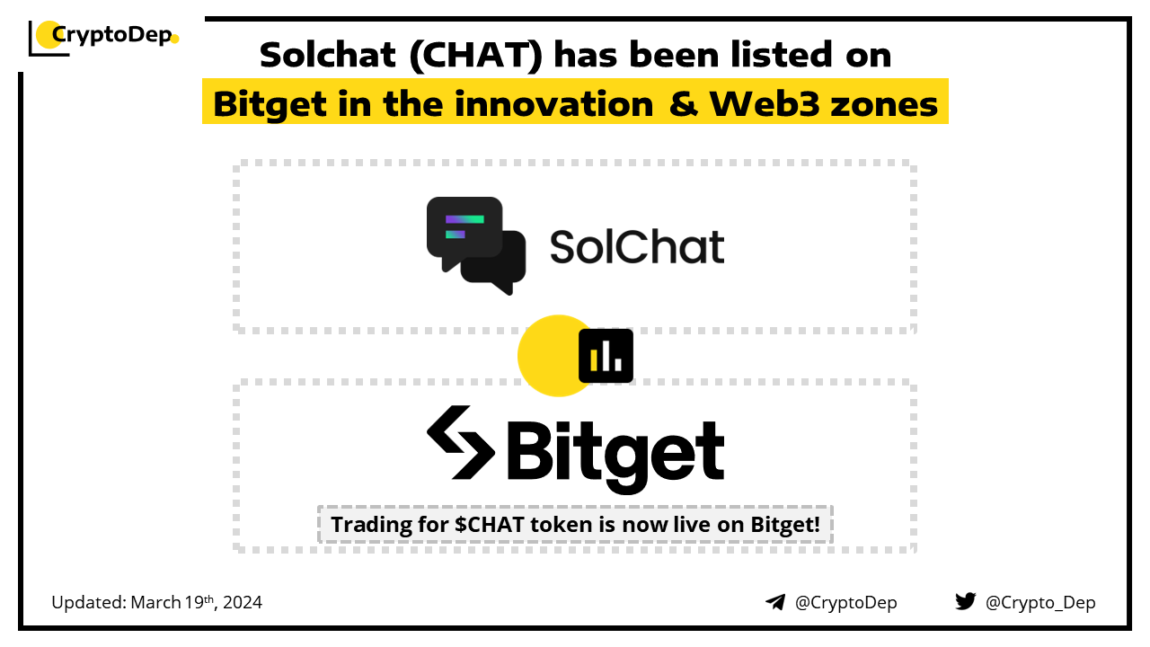 Trading for the $CHAT token is now live on the Bitget exchange! Deposits are now open and withdrawals will open on March 20th, 12:00 UTC. Solchat is a communication protocol on the Solana blockchain, offering text, voice, and video calls similar to Web2, but in a Web3 environment.