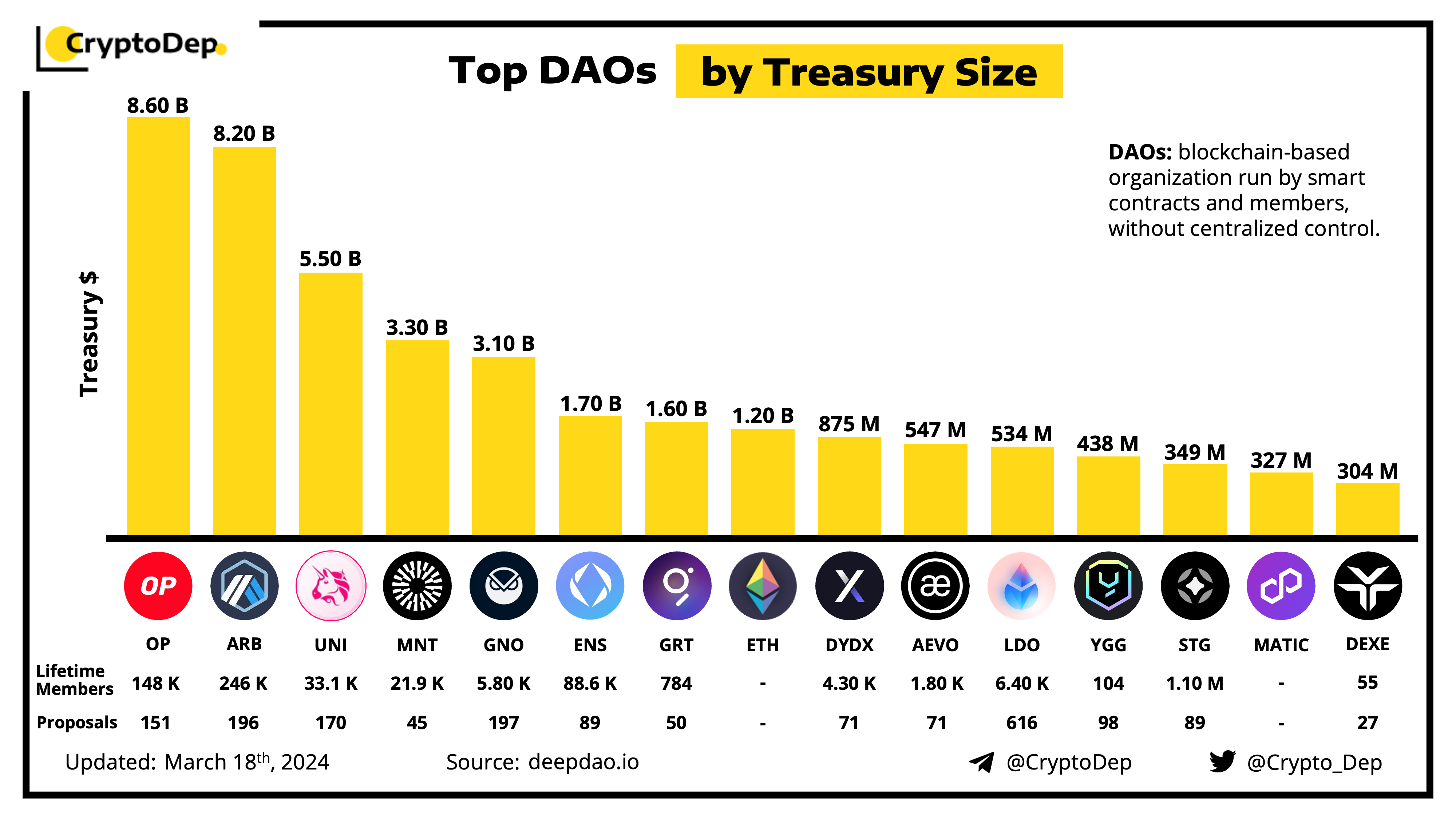 According to the data from DeepDao, as of March 18th, approximately 20,000 DAOs have $40.3B owned assets. We have composed the list of top DAOs, ranked by the total assets that the DAO may use at its discretion.