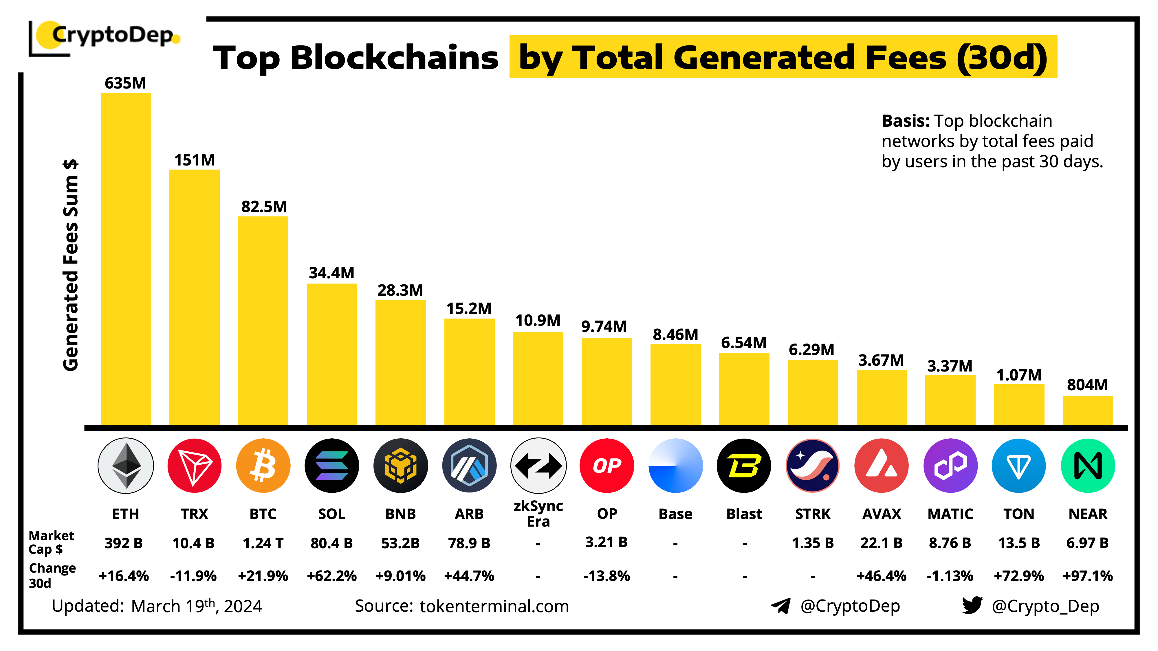 Let's take a look at the ranking of top blockchain protocols by total fees paid by users in the past 30 days, according to the data from Tokenterminal.