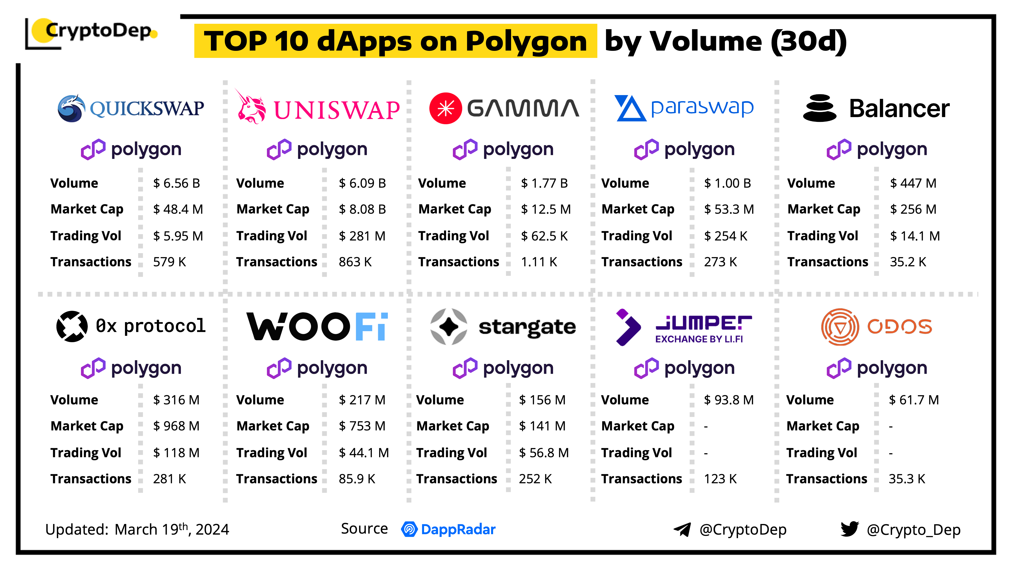 A decentralized application (dApp) is a program built on blockchain that combines a smart contract and a front-end user interface. We present the top dApps on #Polygon by volume in the last 30 days, according to the data from DappRadar.