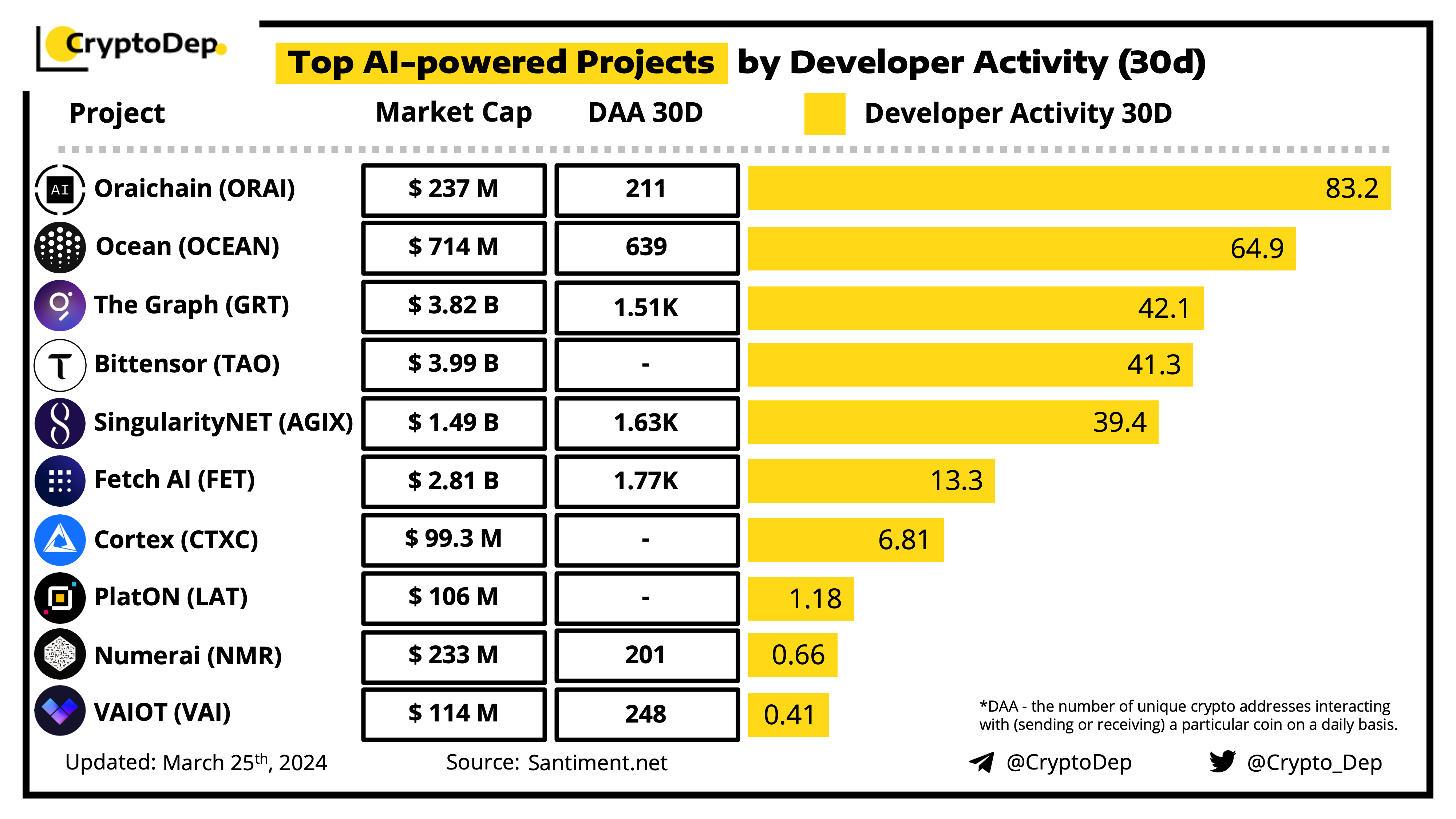 Dev.Activity - the development activity of a project done in its public Github repositories. Development Activity metrics are measured in a number of Github events.