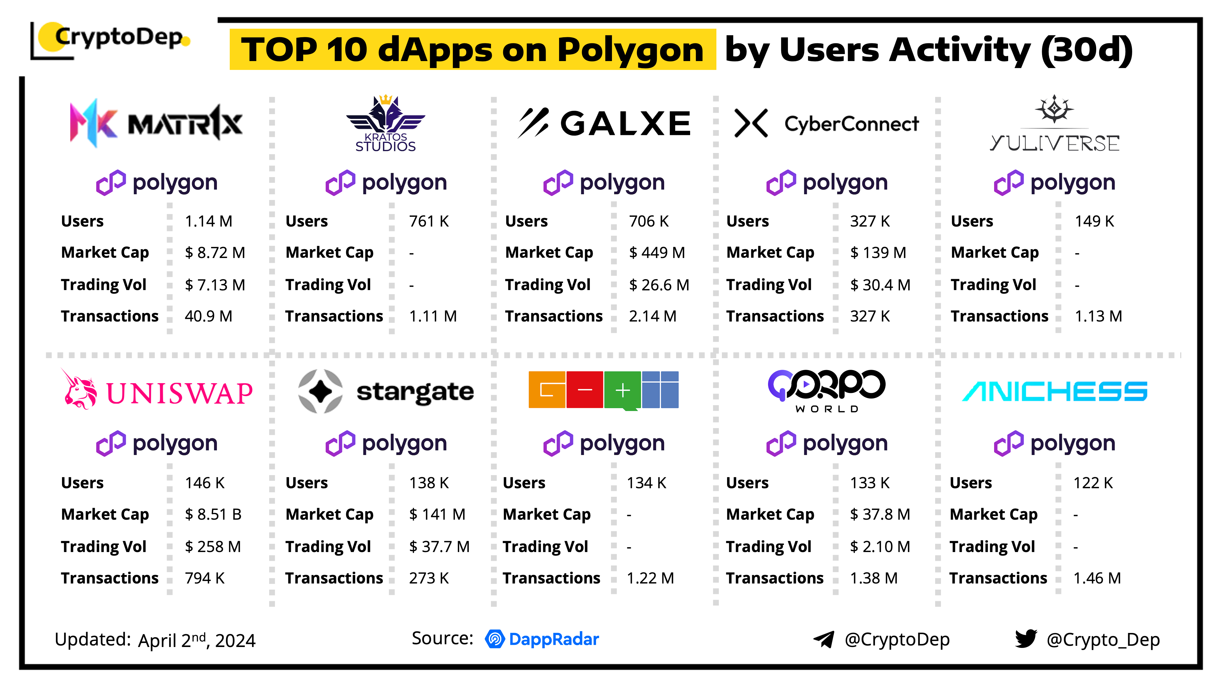 A decentralized application (dApp) is a program built on blockchain that combines a smart contract and a front-end user interface. We present the top dApps on #Polygon by volume in the last 30 days, according to the data from DappRadar.