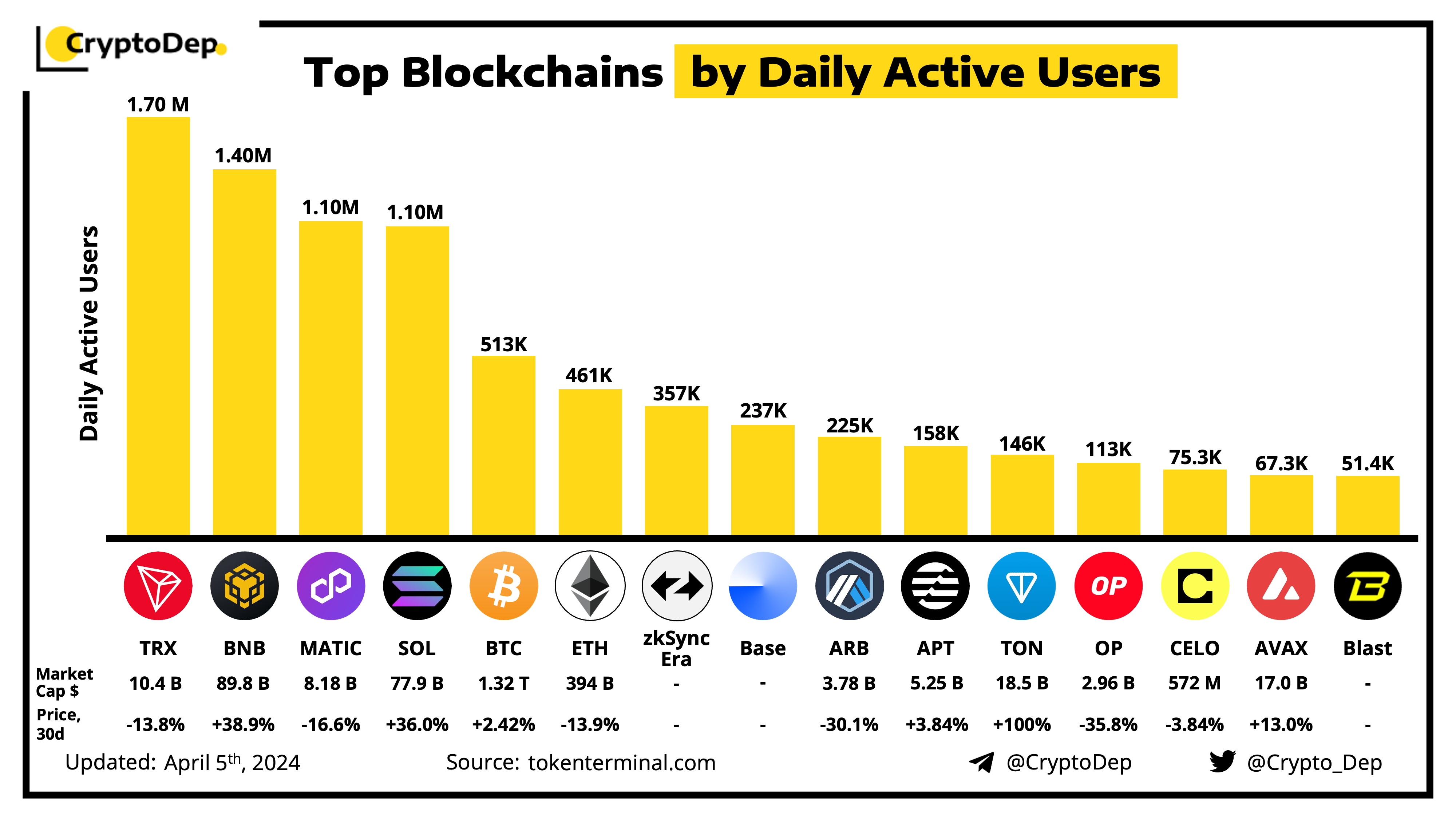 Daily active users measure the number of distinct addresses interacting with blockchains' relevant contracts. According to the data from TokenTerminal, Tron, BNB Chain, Polygon, Solana, and Bitcoin networks have drawn the largest numbers of users lately.
