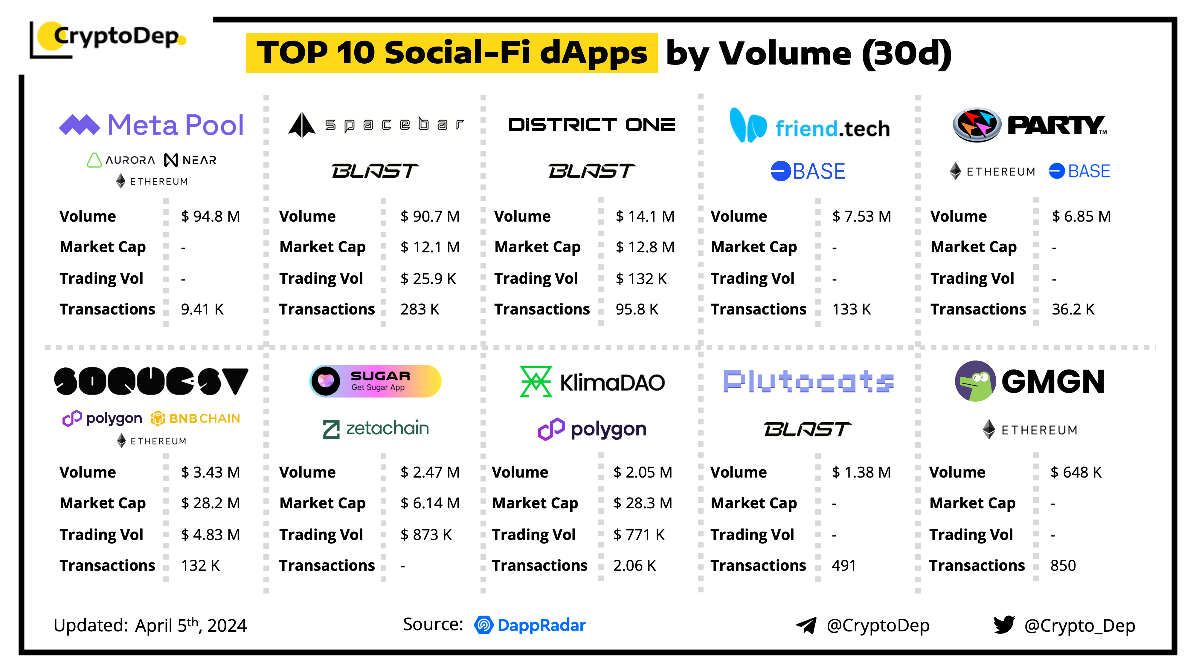ββTOP 10 Social-Fi dApps by Volume (30d)