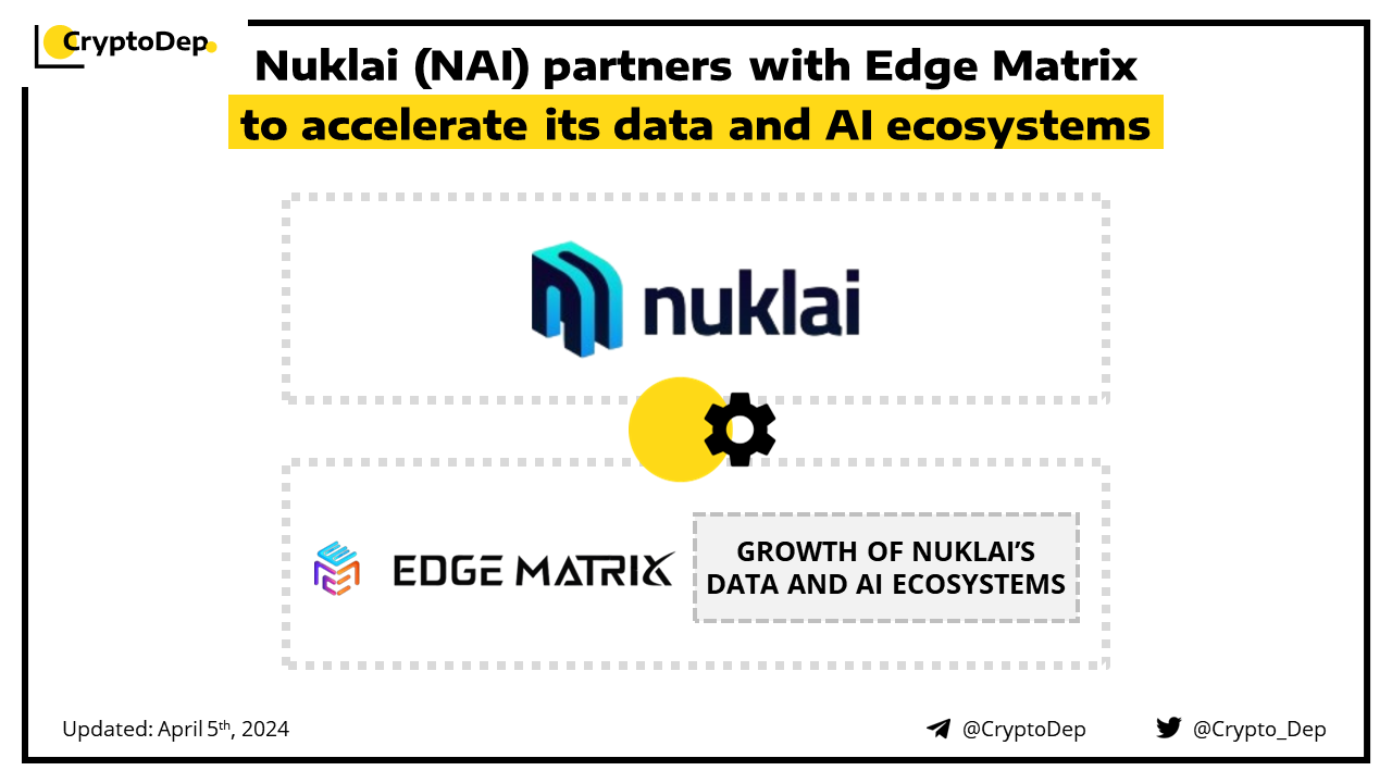 Nuklai teams up with Edge Matrix, a multi-chain AI DePIN infrastructure provider. This integration aims to bolster the development of Nuklai's data and AI ecosystems. Moreover, Nuklai will join the Edge Matrix's ecosystem of partners which includes Nvidia and Dfinity.