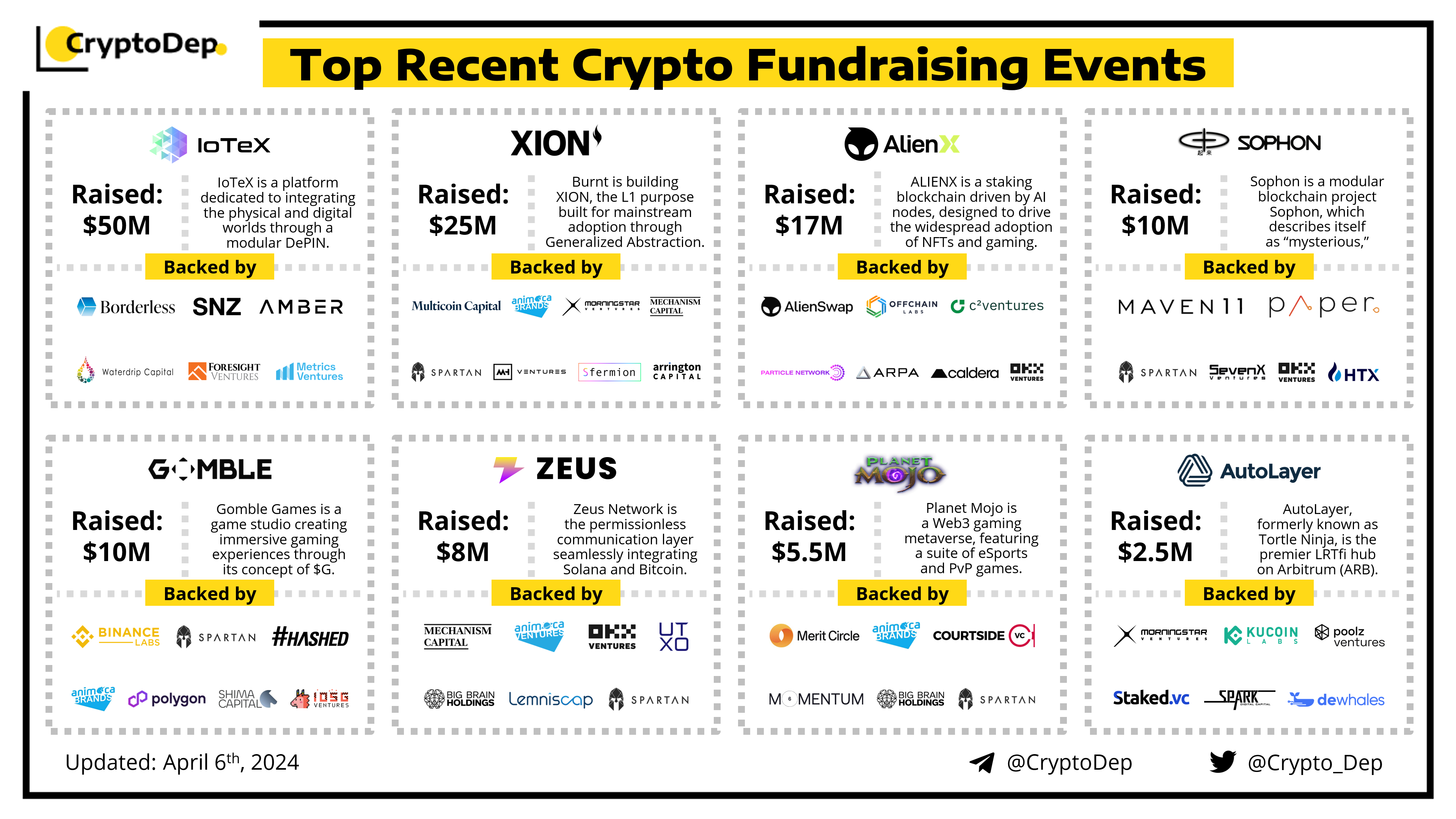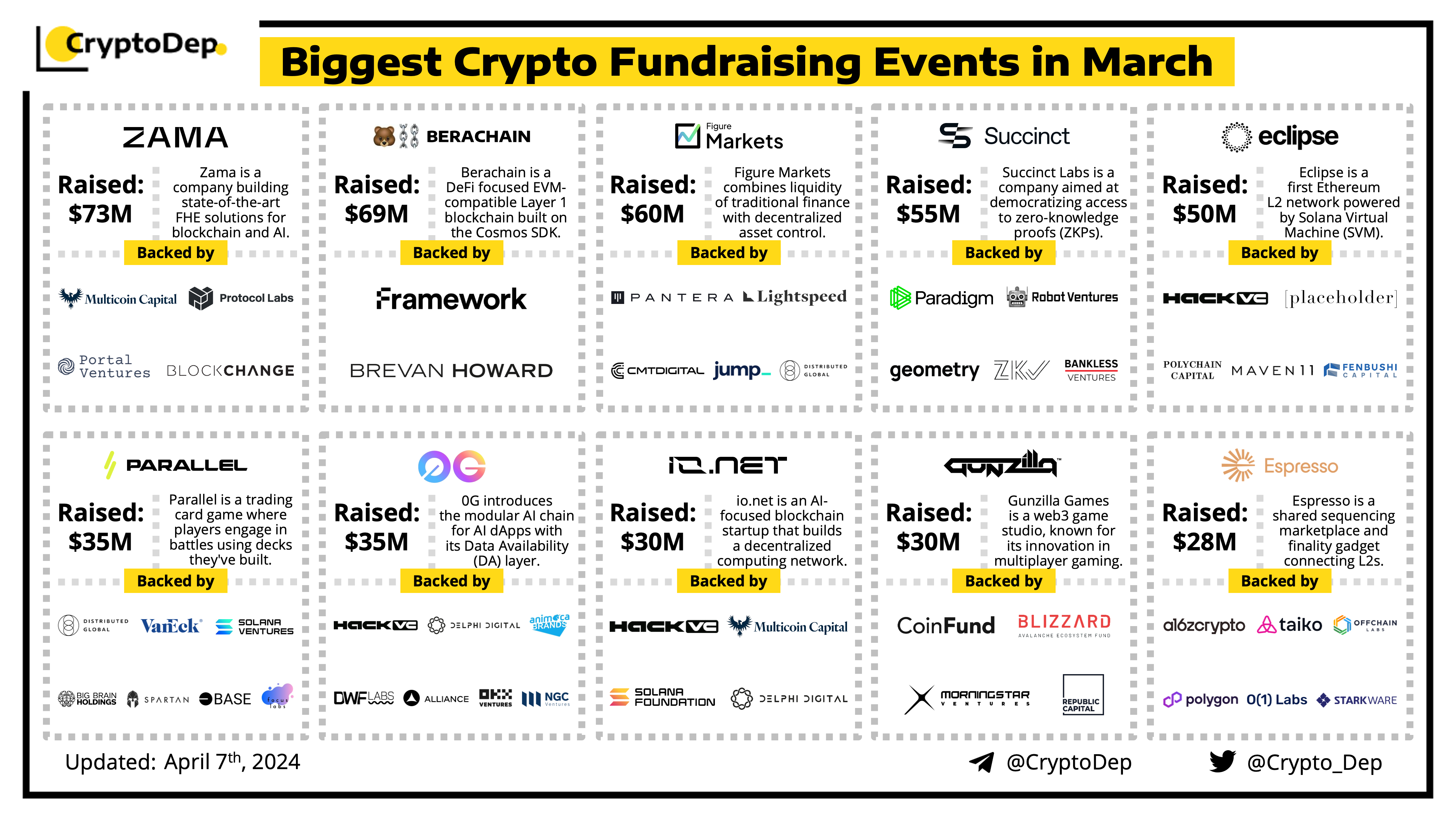 Presenting a list of the biggest crypto fundraising rounds in March 2024, backed by well-known investors such as Paradigm, a16z, CoinFund, Pantera Capital, Hack VC, Polychain Capital, Multicoin Capital, Delphi Digital, Blizzard Fund, Framework Ventures, Solana Ventures, Morningstar Ventures, Polygon Ventures, and others. Let's take a look!