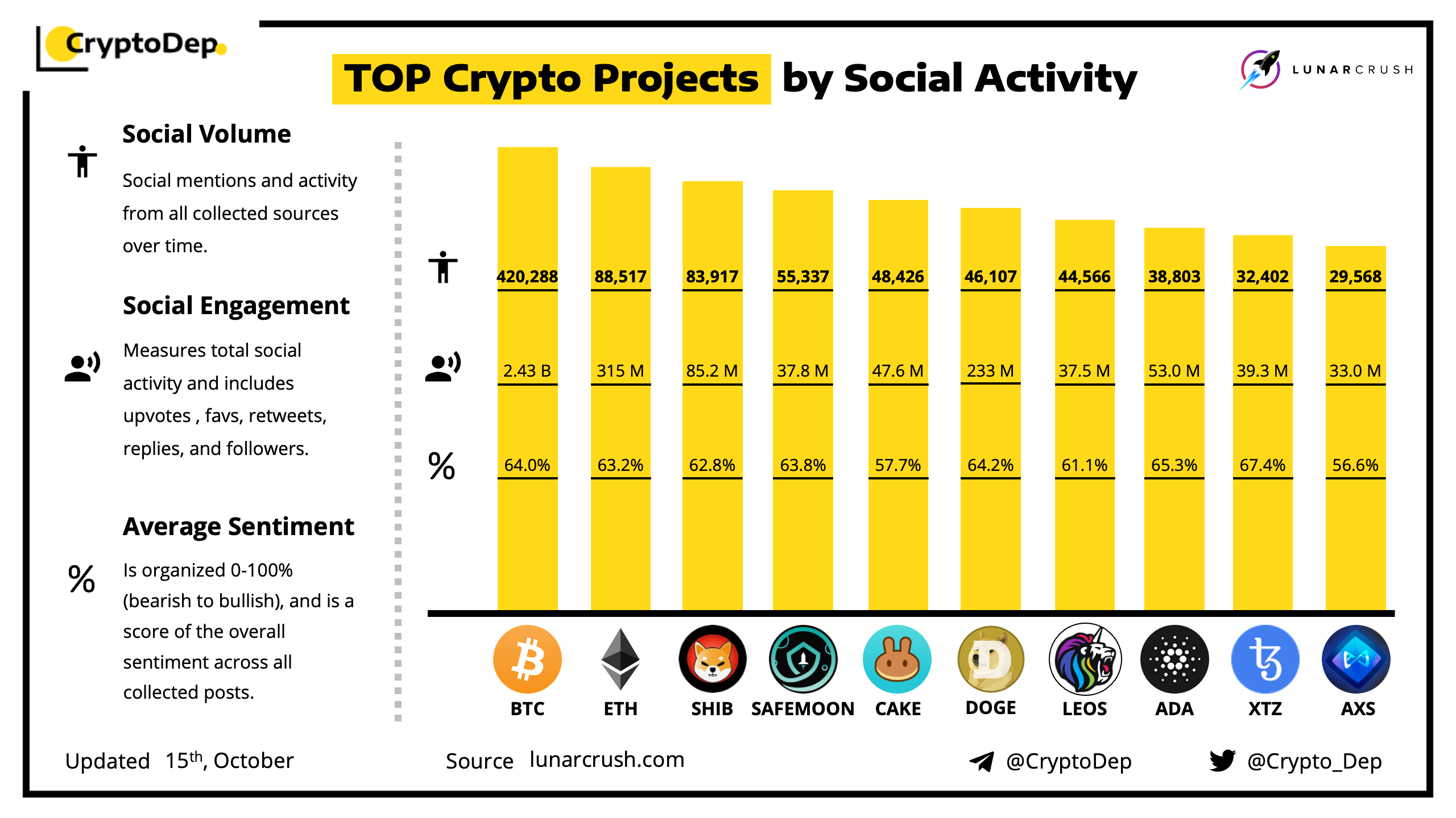 Social Engagement measures total social activity and includes upvotes, favs,retweets, replies, and followers.