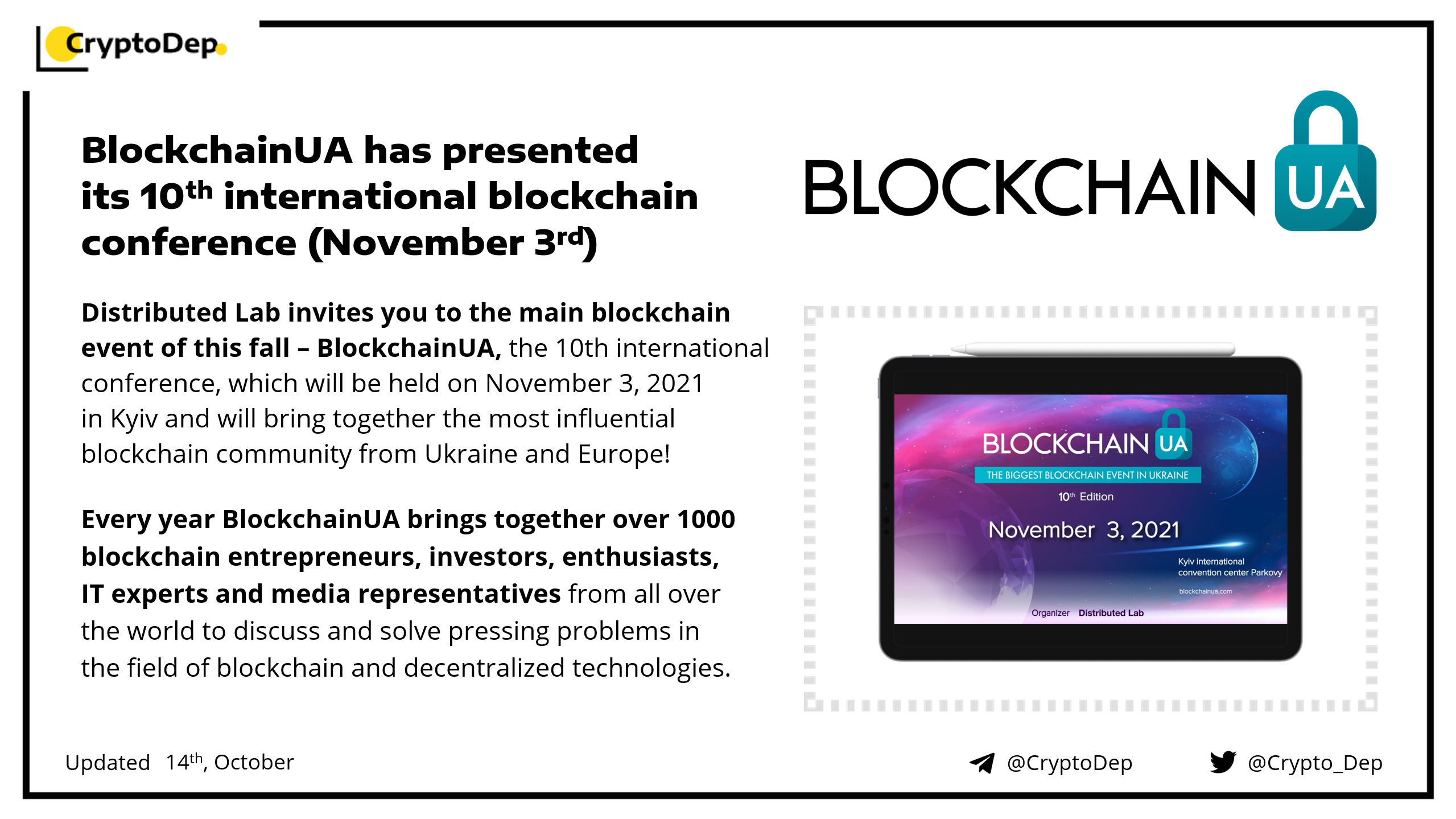 Distributed Lab invites you to the main blockchain event of this fall β #BlockchainUA, the 10th international conference, which will be held on November 3, 2021 in Kyiv and will bring together the most influential blockchain community from Ukraine and Europe!