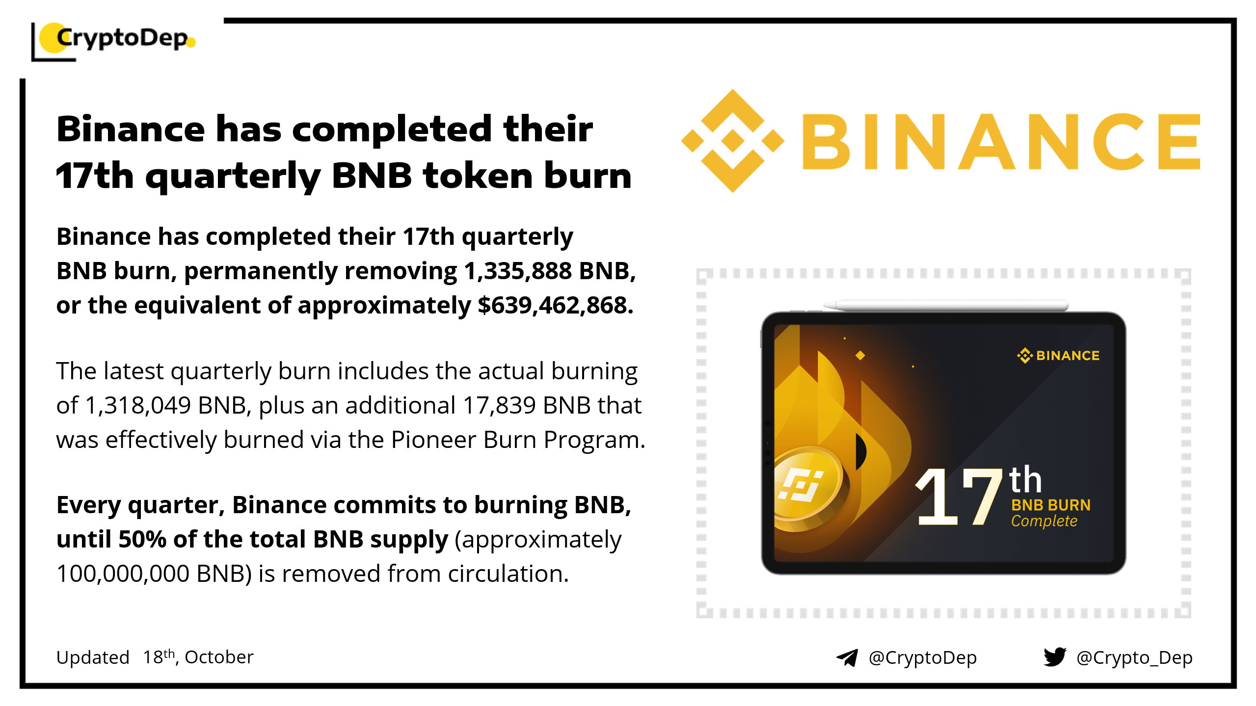 Binance has completed their 17th quarterly BNB burn, permanently removing 1,335,888 BNB, or the equivalent of approximately $639,462,868.