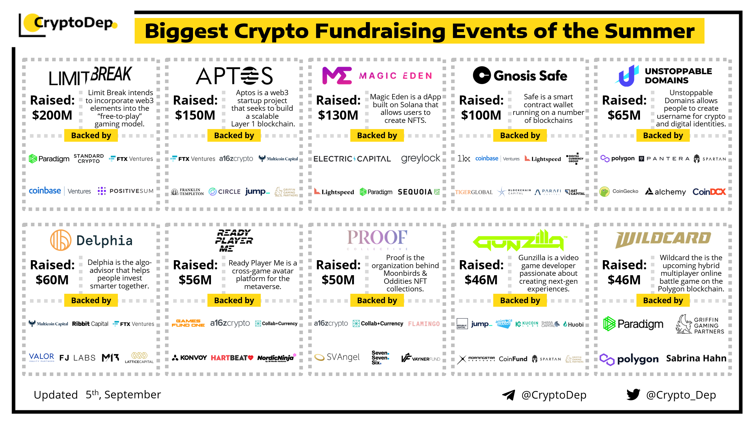 We are excited to present a list of some biggest crypto fundraising events of summer 2022, backed by well-known investors such as Sequoia Capital, a16z, Paradigm, Coinbase Ventures, FTX Ventures, Circle Ventures, Digital Currency Group, Pantera Capital, Greylock, Lightspeed, Animoca Brands, Multicoin Capital, CoinFund, Jump Capital, Morningstar Ventures, Blockchain Capital, Shima Capital and others. Let's take a look!