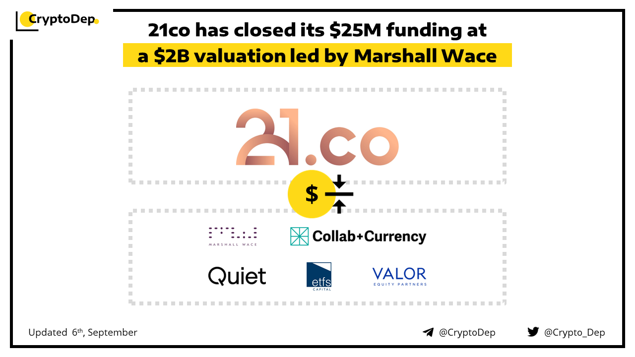 21co, a crypto investment product firm has raised $25M at a $2B valuation. The investment was led by Marshall Wace with participation from Collab+Currency, Quiet Ventures, ETFS Capital, and Valor Equity Partners. With the fresh funds, 21co will continue to accelerate growth, key market expansions and strategic talent acquisitions.