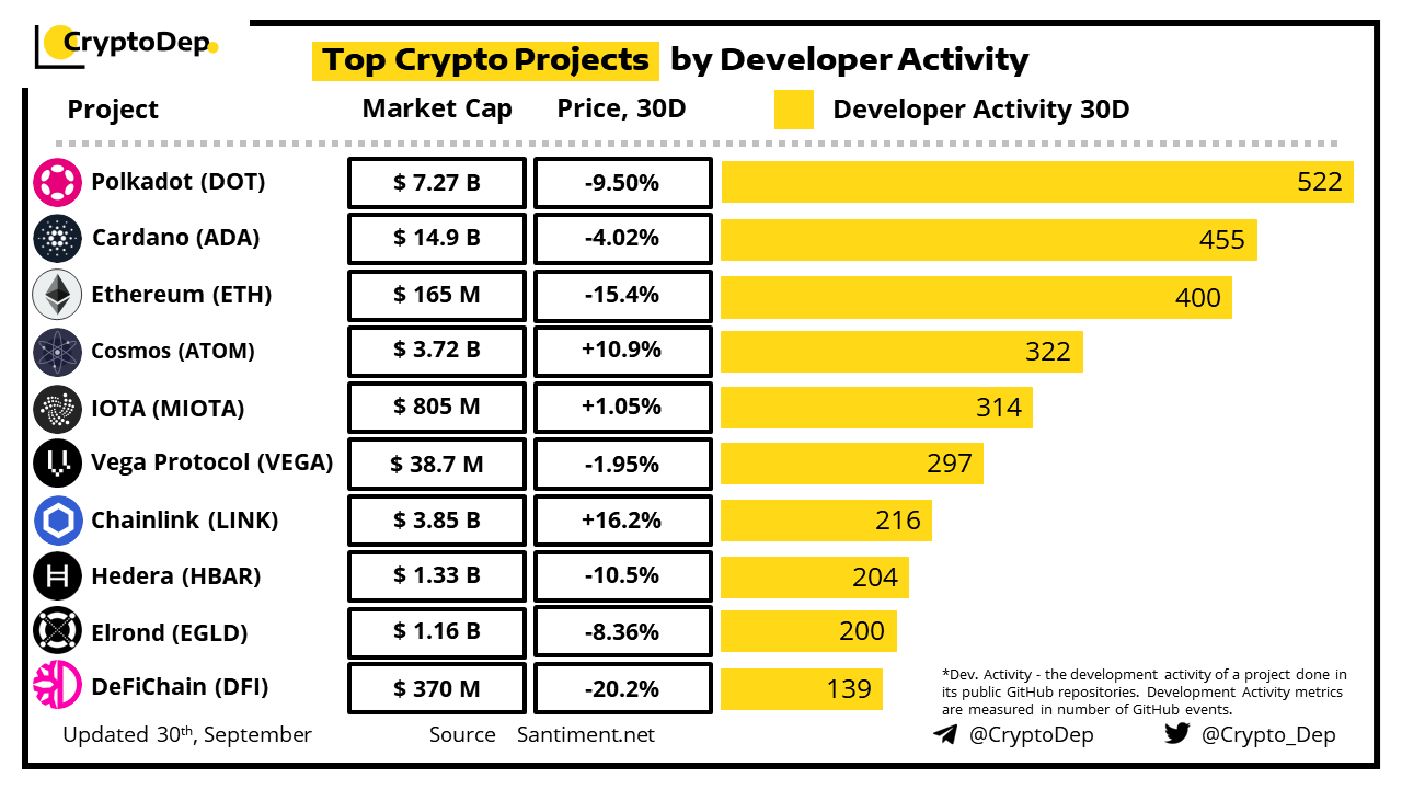 Dev.Activity - the development activity of a project done in its public Github repositories. Development Activity metrics are measured in a number of Github events.