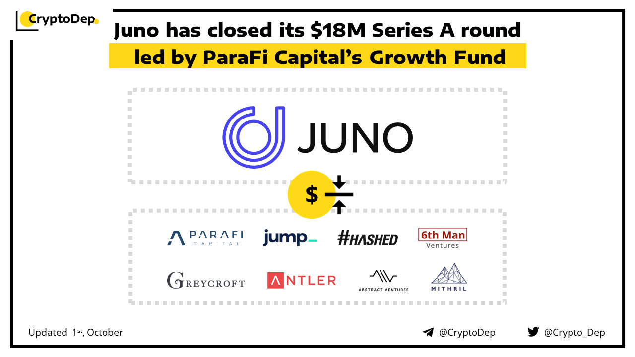 Juno, a Web3 banking platform, has raised $18M in a Series A funding round led by ParaFi Capitalβs Growth Fund with participation from Hashed, Jump Crypto, 6th Man Ventures, Greycroft, Antler Global, Abstract Ventures, Mithril, and Uncorrelated Fund. The funds will be used to expand products and operations, and launch its its loyalty token, $JCOIN. Its flagship product is the Juno card, where users can transact with Circleβs stablecoin $USDC.