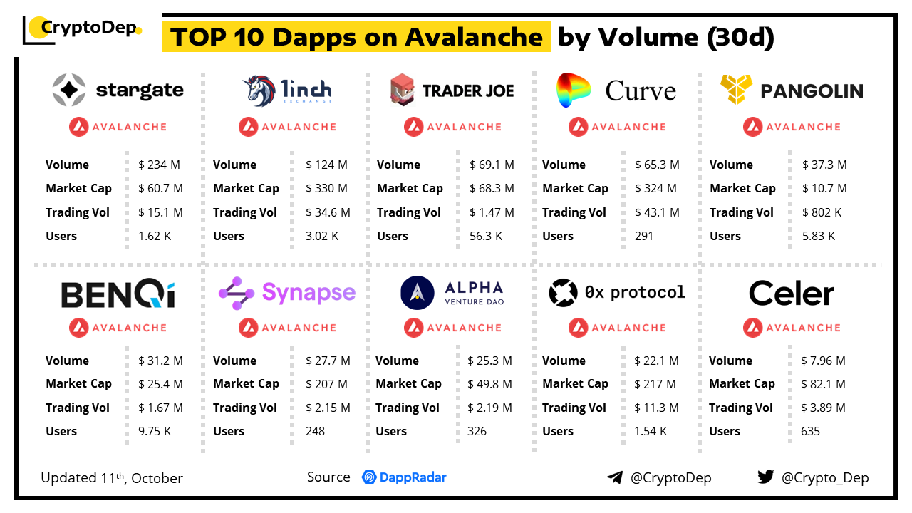 ββTop 10 Dapps on Avalanche by Volume (30d)