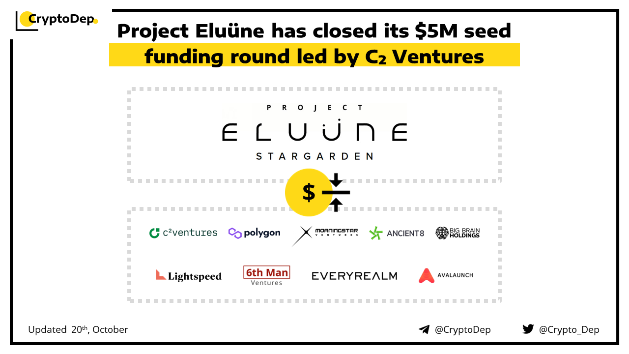 Project EluΓΌne, a team-based, auto-chess battler with RPG mechanics, has announced the closure of the $5M seed funding round led CΒ² Ventures. Polygon, 6MV, Lightspeed, Everyrealm, Morningstar Ventures, Avalaunch, Big Brain Holdings and Ancient8 have also participated in the investment. Project EluΓΌne recently launched Mission Control, a browser based dashboard for social status building within the ecosystem.