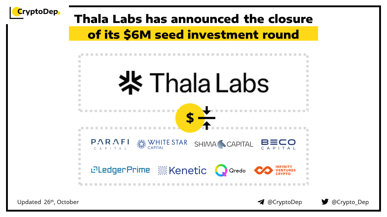 Thala Labs, a decentralized finance company has closed its $6M seed funding round co-led by ParaFi Capital, White Star Capital, and Shima Capital. Additional round investors included Beco Capital, LedgerPrime, Saison Capital, Kenetic Capital, Qredo, and Infinity Ventures Crypto. Thala Labs will use the new funds to accelerate hiring and increase the number of security audits it has received.